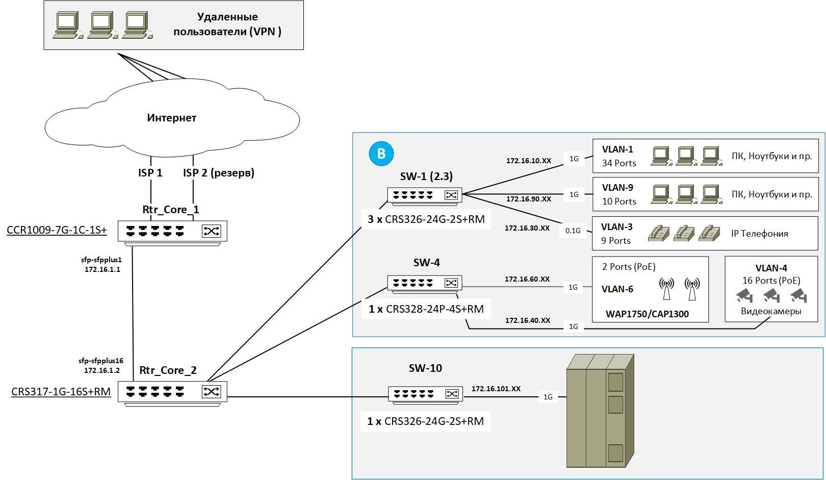 nic_123 Posted September 30, 2020 Author Posted September 30, 2020 @Saab95 14 часов назад, Saab95 сказал: Тут зависит от того, какие скорости по сети. Добрый день ) Скорости.. точных данных к сожалению нет т.к. статистика ранее не велась. Но по просьбе рук. топологию делал на максимум, кстати по вашим советам , за которые отдельное спасибо! )) Магистрали на оптике 10G, ну а хосты на 1G. 14 часов назад, Saab95 сказал: Если у вас там до гига, то можно все L3 вынести на коммутаторы, если больше, то делать вланы. Подробнее можно плиз? По магистралям планирую больше гига, потому и 10G.. ну и VLANы само собой. 14 часов назад, Saab95 сказал: CRS317 настраиваем просто - все порты в бридж. CRS326 и 328 настраиваете так же бриджами, но со снятием вланов на нужных портах. CCR1009 настраиваете вланы, вешаете на них IP, настраиваете DHCP и т.п. Так вроде так и сделал - все порты в бриджи, на свичах делаю антагет на интерфейс нужный VLAN. Но какие то постоянные глюки... потери пакетов, отваливается винбокс, а иногда при подключении вообще никаких настроек не показывает... как будто нет ни интерфейсов, ни бриджа и пр. Возможно у меня ошибка в управляющем VLAN.. я его "повесил" на VLAN1 - правильно ли это? У циски вроде VLAN1 дефолтный, зарезервирован т.е. использовать его нельзя. А как у Микрота? Или ошибка в назначенных IP на интерфейсах? Подключаясь через VLAN1 винбокс выдает два варианта подключения к роутерам т.е. по двум интерфейсам - один с назначенным IP 172.16.1.1 , а второй IP 0.0.0.0 (1009 например), если подключаюсь через назначенный VLAN (60 например ) винбокс дает возможность подключиться только к шлюзу этой подсети т.е к CCR1009 по IP 172.16.60.1 , хотя из этой подсети пингуются все роутеры .. в чем засада? Вставить ник Quote