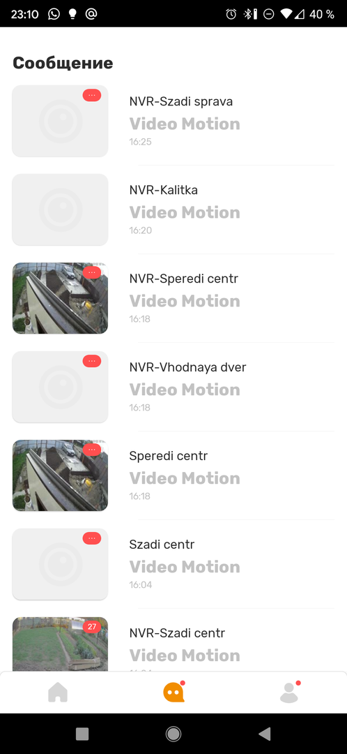 sandro_66 Posted October 2, 2020 Posted October 2, 2020 Добрый день! Имею видеорегистратор dhi-nvr4116-4ks2. При детекции движений в мобильных приложениях типа dmss и imou life в на android в разделе сообщений - личные сообщения сохраняются короткие записи детекции движения с превью картинкой возле времени сообщения (на скрине показано), только почему то превьюшки показаны не во всех камерах (а иногда даже бывает так, что в одной камере для некоторых событий превьюшки имеется а на некоторых событиях поче-то отсутствует). С чем это может быть связано и можно ли это исправить, чтобы превьюшки показывались для всех событий срабатывания детекции движения и для всех камер? Камеры к регистратору получены разные: 2 imou bullet, 4 аналоговые камеры с(потоки от регистратора dahua xvr 5104 (модель точно не помню), и китайские камеры по onvif (всего 13 камер). Причем в основном превьюшки показываются с xvr и imou bullet, и ещё с парочки камер по onvif. И ещё есть второй вопрос с этими сообщениями - почему то не всегда показаны сообщения на события, в т.ч. на события с xvr и imou bullet, как буд-то часть сообщений либо пропадает, либо не записывается. Как тут быть? Сообщения с регистратора nvr в программах imou life и dmss на андроид смотрю с записей с жёсткого диска в регистраторе (в облако dahua или imou не пишу). Заранее спасибо за ответы! Вставить ник Quote