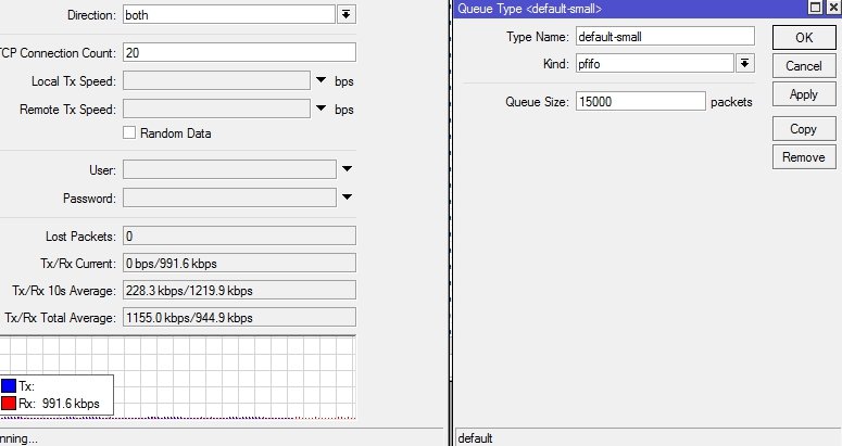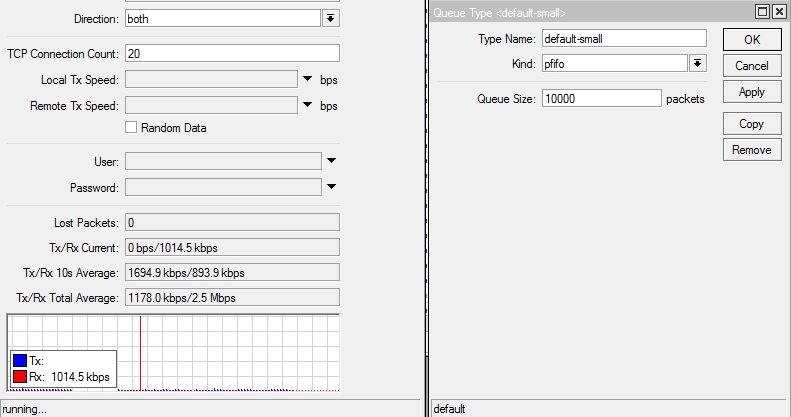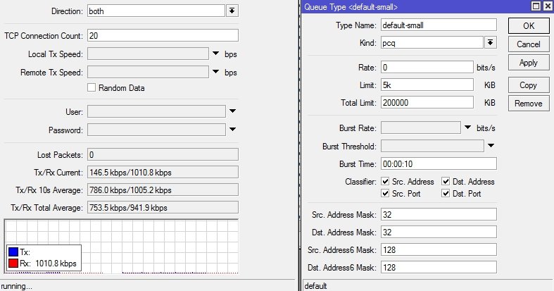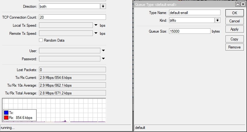 Fint Posted October 14, 2020 Posted October 14, 2020 (edited) Приветствую. Заметил интересную особенность. Делая Бтест до клиента в обе стороны нисходящая скорость не достигает тарифной в TCP, в UPD все норм. С отключенным шейпером тоже все норм. Используется тип очереди pcq. Все примеры на тарифе 3/1 Мбит. Проверил на pfifo с буфером 10000 и 15000, тоже самое за исключением того что не держится в среднем 200-300 кбит а скачет 0-3Мбит. С очередью bfifo как кажется все хорошо Ну и с отключенным шейпером Это из за переполнения буферов бтестом? Какой тип очереди лучше использовать и какой буфер? pcq же позволяет приложениям абонента не душить друг друга? Edited October 14, 2020 by Fint Вставить ник Quote