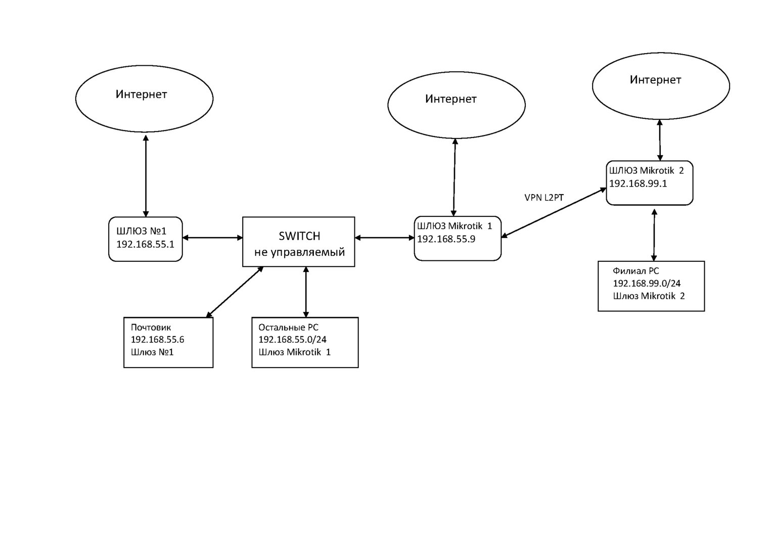 victor-2003 Posted October 22, 2020 Posted October 22, 2020 добрый день! Уважаемые гуру. прошу помощи. Приложил схему, чтобы проще мне объяснить в чем проблема. Имеются два Микротика и шлюз №1 не микротик, который нужен только для почтовика. Два Микротика соединены между собой VPN-L2pt. Роутинги прописаны на двух Микротиках. Проблема заключается в том, что все PC с подсети 192.168.99.0 видят все PC подсети 192.168.55.0 кроме Почтовика и Шлюза №1. Подскажите где нужно копать, не могу сообразить? Вставить ник Quote