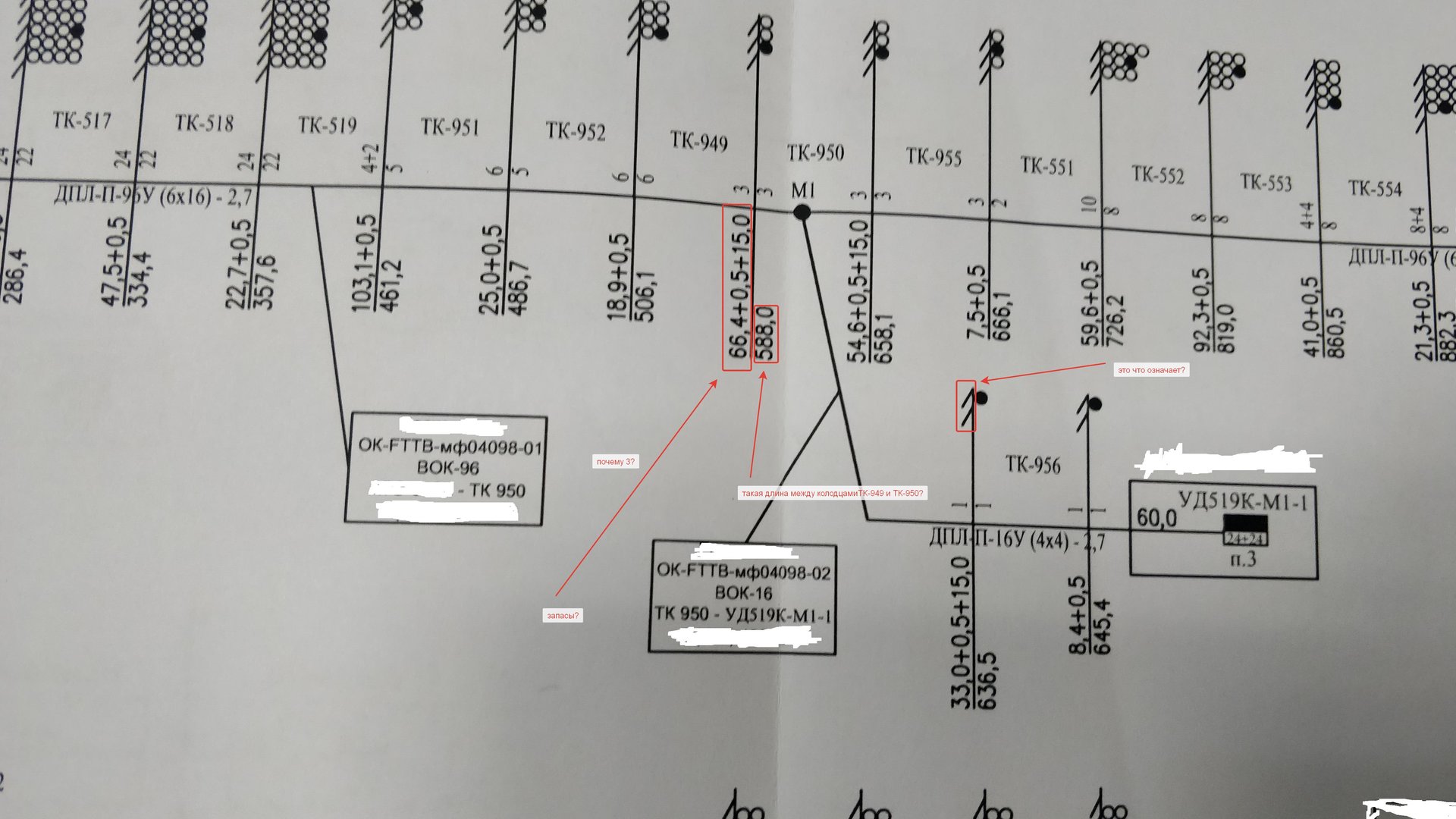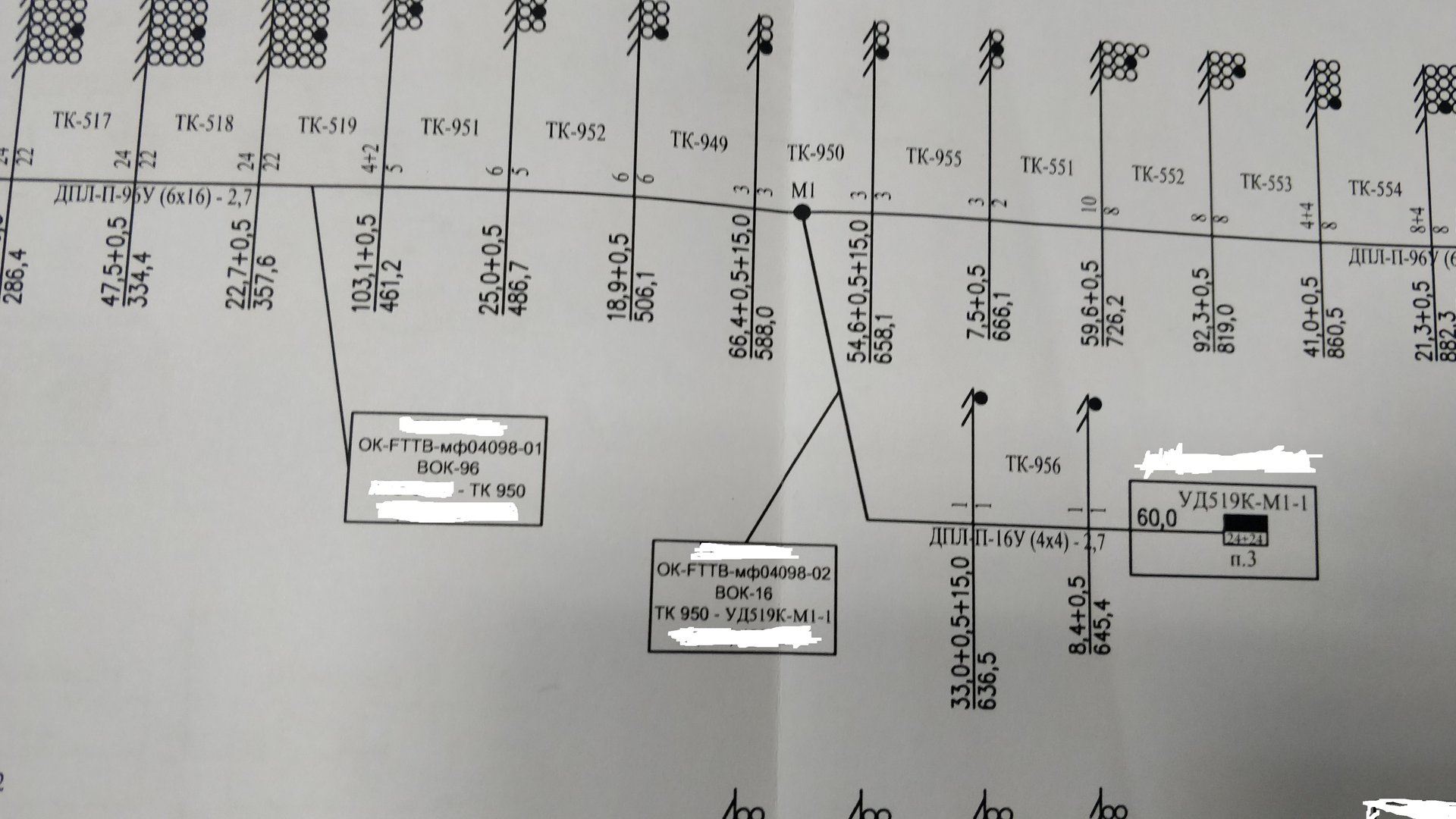 vols-vl Posted November 17, 2020 Posted November 17, 2020 (edited) 37 минут назад, kalmyk сказал: Ну так я не понимаю эту схему. А чего там сложного??? ТК-517, ТК-518, ... - номера кабельных (телефонных) колодцев, если использована стандартная нумерация колодцев, то 5ххх - это колодцы среднего типа (ККС-4), 9хх - колодцы малого типа (ККС-3); 24/22, 4+2/5 - в числителе указана емкость канализации, в знаменателе - номер канала, занимаемого данным кабелем; для дураков сверху чертежа сделана развертка колодцев, на которой указаны каналы, занимаемые кабелем; ДПЛ-П-96у (6х16)-2.7 - тип кабеля: марка - ДПЛ, оболочка - полиэтилен, 96 ОВ - 6 модулей по 16 волокон в каждом, 2,7 - максимально допустимая растягивающая нагрузка на кабель в кН; остальное смотри у @sdy_moscow. Раньше этому учили в ПТУ. :))) Edited November 17, 2020 by vols-vl Вставить ник Quote
