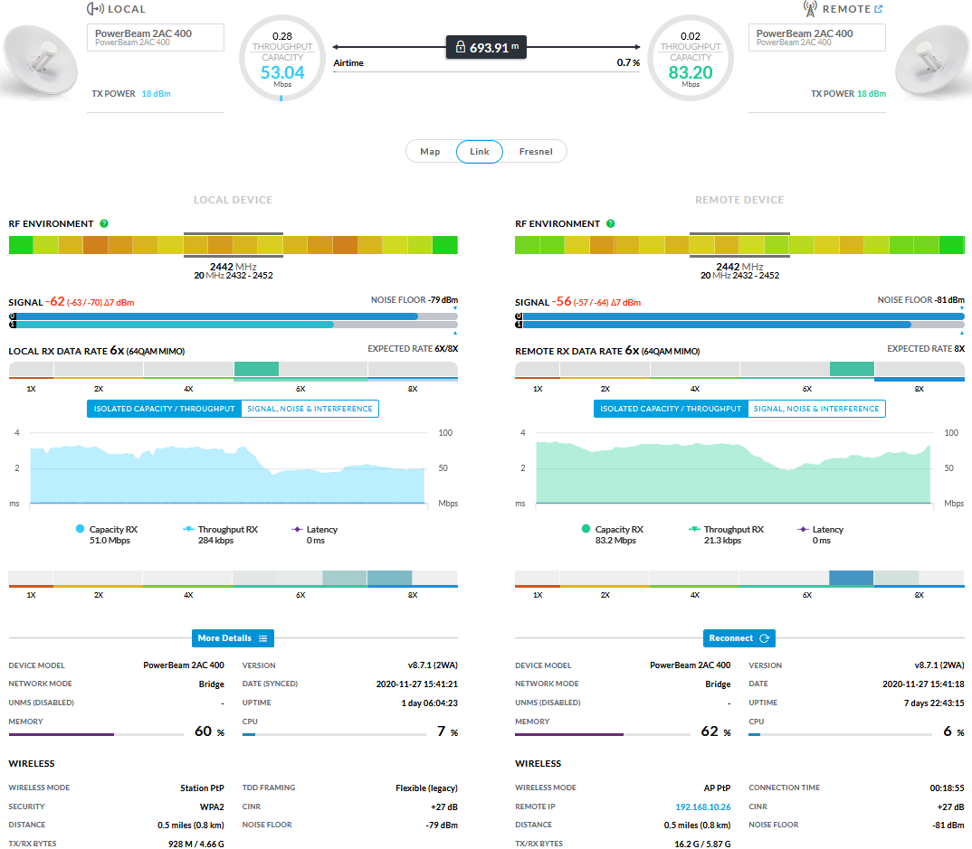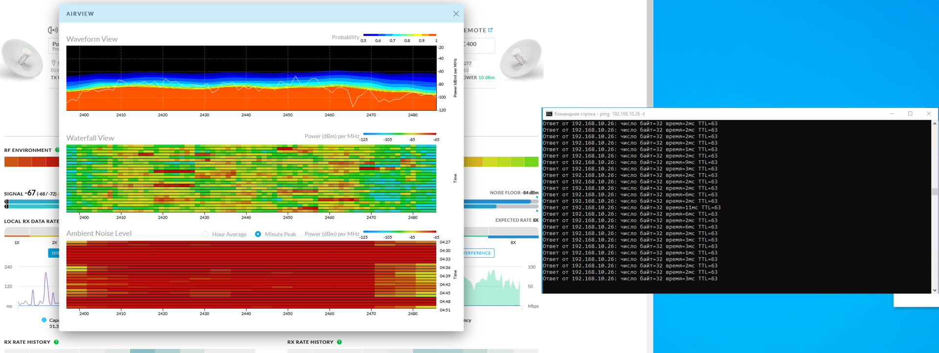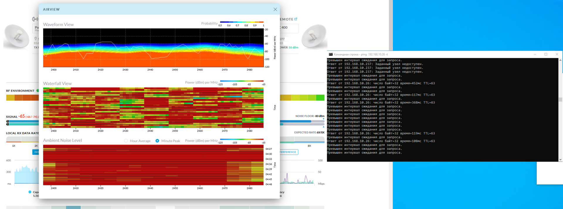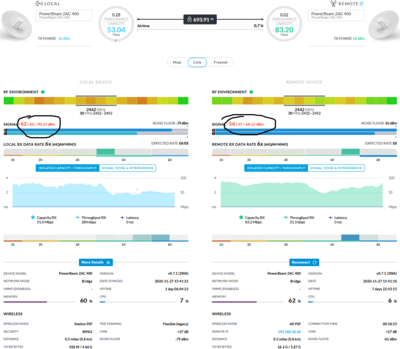 jappleseed89 Posted November 27, 2020 Posted November 27, 2020 Добрый день. Имеется радиомост на двух Ubiquiti PowerBeam 2AC 400 (2.4 Ггц), расположение в крупном городе, расстояние 800 м., прямая видимость, зона Френеля чистая. Ширина канала 20 МГц, скорость легко может достигать 90-100 Мбит/сек, пинг 2-3 мс. Но. Периодически возникают какие-то дикие помехи по всему диапазону 2.4 ГГц, если судить по инструменту AirView (если я правильно интерпретирую его показания). В эти моменты (от 1 минуты до несколько минут обычно) передача полностью прекращается, ping не проходит, точки могут разъединиться. Помехи возникают без какой-либо системности, могут раз в час, может их не быть много часов подряд, а потом они могут начаться почти непрерывно (по 1-2 минуты), с перерывами в несколько минут. Прикладываю скриншоты: 1 - картина AirView и ping во время помех 2 - картина, когда помех нет Что пробовал: - Менять частоту (бесполезно, т.к судя по графику, проблема на всей частоте 2.4 ГГц) - Менять мощность сигнала от -4dbm до 27 dbm, даже макс. мощность не помогает во время помех - Ставить полосу 10 Мгц, 1 канал, выключать все агрегации - связь оставалась, но скорость 8 Мбит/сек - совсем не то, что хотелось бы. Еще факт в том, что до этого на этом самом же месте 3 года стоял радиомост на точках Nanostation M2 (широконаправленные, без тарелки), с теми же самыми настройками, и никаких проблем со стабильностью не наблюдалось, но скорость была невысокая. Приложу еще скриншот (3) главной страницы, временно работает на таких настройках. Антенны направлены практически точно друг на друга с помощью камеры с 20х оптическим зумом, тарелки точно по центру фотографий. Однако пишется, о том, что большая разница в сигналах per chain. Что это может быть, и что посоветуете сделать? ПС. Если считаете нужным, перенесите в форум по Ubiquiti. Вставить ник Quote