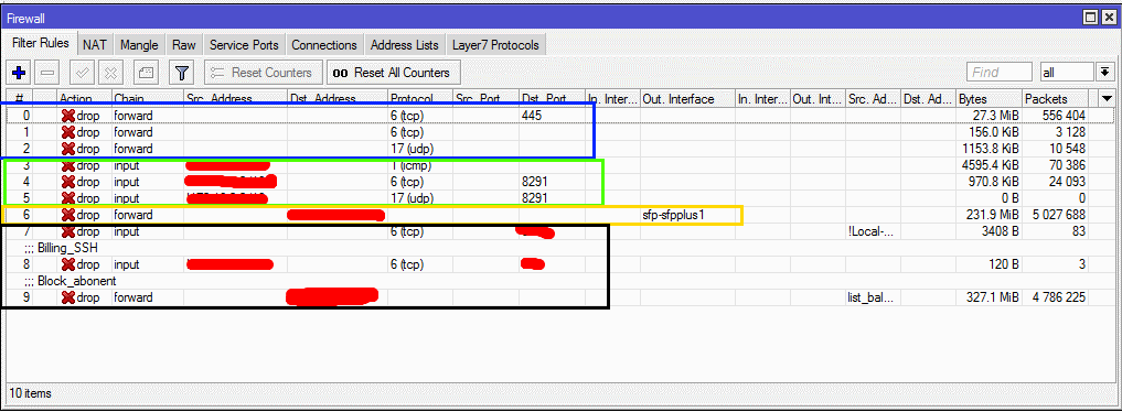 Saab95 Posted February 18, 2021 Posted February 18, 2021 2 часа назад, seagull сказал: Писал же, чему там жрать в файрволе, если большинство пакетов дальше 1-2 правила не проходят по цепочке??? 2 часа назад, seagull сказал: Вообще кстати, best practice все же закрывать все, а открывать только нужное, а не наоборот. Как в этом случае по цепочке проходят правила? В этом случае 100 процентов пакетов, проходящих через оборудования, проходят через файрвол. Вот во вложении картинка, всего 9 правил: 0-2 выделено синим это защита от пропуска в сеть вирусных портов 445 и 1900. Блокируется входящий и исходящий трафик по ним. 3-5 блокировка ограничения доступа на микротик, разрешено только с админской подсети. С остальных адресов на него попасть нельзя (запустить пинг, зайти в винбокс). 6 правило блокировки возврата трафика, то есть нельзя отправлять в интернет трафик с IP назначения = IP своих белых подсетей. 7 блокировка доступа на веб прокси всем, кроме адресов абонентов. 8 блокировка доступа на микротик через ssh всех, кроме биллинга. 9 блокировка доступа в интернет абонентов, IP которых есть в адрес листе. Все службы кроме винбокса и ссш отключены. В пиках проходит до 5г трафика, CCR1036, никаких проблем не возникает. Вставить ник Quote