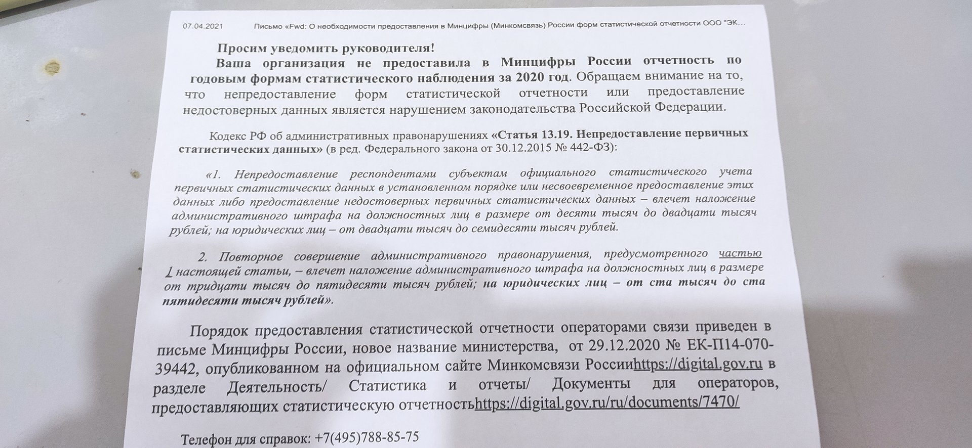 Алекксандр Posted April 7, 2021 Posted April 7, 2021 Колеги приветствую. Нужна ваша помощь пришло письмо от МИНЦИФРЫ РОССИИ*** , что якобы не здали отчет (статья 13.19 Непредоставление первичных статических данных" )., то есть получается по форме годовых отчетов это : 1. форма №18 (структура почтовой сети) , 2- Форма №40 (сведения о технических средствах спутниковой связи и вещания.) Нитого ни другого у нас нет, по сути организация подразумевается как микро*организация. Как и то сдавал данные отчеты? Нам уже как бы грозят штрафами а как что заполнять не понятно. Сами документы прикрепил (формы отчетов). Ну и само письмо так же предоставляю. prilozhenie_1.pdf Вставить ник Quote
