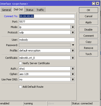 sol Posted July 20, 2021 Posted July 20, 2021 Коллег, занесла меня нелёгкая в командировку. Тут есть неплохой интернет. Роутером выступает микротик какой-то мелкий. Возникла задача подтянуть для удобства всю мою инфраструктуру путём поднятия VPN. С моей стороны linux Fedora 32 и OpenVPN В микроте я дуб. Начитался мануалов, сгенерил центр сертификации, загрузил сертификаты в микрот. Соединение поднимается, микрот адреса получает какие нужно. Т.е. с OpenVPN сервером он "разговаривает". А вот пакетики не ходят. Пробовал и 6-ю ветку и 7-ю. И TCP и UDP.. Итог один. Вот настройки сервера: [root@dserver server]# cat sov7.conf ca /etc/openvpn/easy-rsa/pki/ca.crt cert /etc/openvpn/easy-rsa/pki/issued/myserver.crt key /etc/openvpn/easy-rsa/pki/private/myserver.key dh /etc/openvpn/easy-rsa/pki/dh.pem crl-verify /etc/openvpn/easy-rsa/pki/crl.pem proto udp dev tun2 # ifconfig 10.173.123.29 10.173.123.30 topology subnet mode server server 10.173.110.0 255.255.255.0 client-config-dir /etc/openvpn/server/ccd client-to-client port 5577 daemon no-replay ping 10 ping-restart 30 # cipher AES-256-CBC cipher AES-128-CBC # cipher BF-CBC auth SHA1 # tun-ipv6 tls-server local XX.XX.XX.XX user nobody group nobody root@dserver server]# ifconfig tun2 tun2: flags=4305<UP,POINTOPOINT,RUNNING,NOARP,MULTICAST> mtu 1500 inet 10.173.110.1 netmask 255.255.255.0 destination 10.173.110.1 inet6 fe80::8a3f:27a7:7da0:7808 prefixlen 64 scopeid 0x20<link> unspec 00-00-00-00-00-00-00-00-00-00-00-00-00-00-00-00 txqueuelen 100 (UNSPEC) RX packets 0 bytes 0 (0.0 B) RX errors 0 dropped 0 overruns 0 frame 0 TX packets 61 bytes 5092 (4.9 KiB) TX errors 0 dropped 0 overruns 0 carrier 0 collisions 0 При этом микрот показывает, что он отвечает. Причём, отвечает каким-то левым адресам. Должен отвечать на пинги 10.173.110.1, а отвечает каким-то левым 8.0.х.х Вставить ник Quote