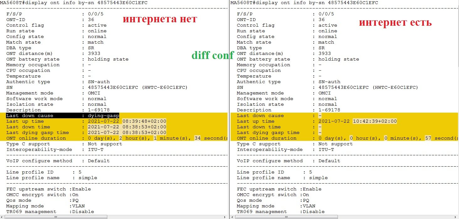 caren.emma Posted July 21, 2021 Author Posted July 21, 2021 Но при удалении настроек ОНУ с ОЛТа она переходит в режим "не зарегистрирована" При добавлении тех же настроек ОНУ на ОЛТ она регистрируется и едет дальше нормально. Возможно где-то около этого крутиться надо ..........? Тоесть все что меняется - это: 1) удаляются настройки этой ОНУ с ОЛТа и те же настройки пишутся обратно 2) во время удаления настроек ОНУ переходит в режим "не зарегистрирована" и при заливании настроек на ОЛТ он регистрируется. Но при этом сервис интернет у пользователя начинает работать нормально. Вставить ник Quote