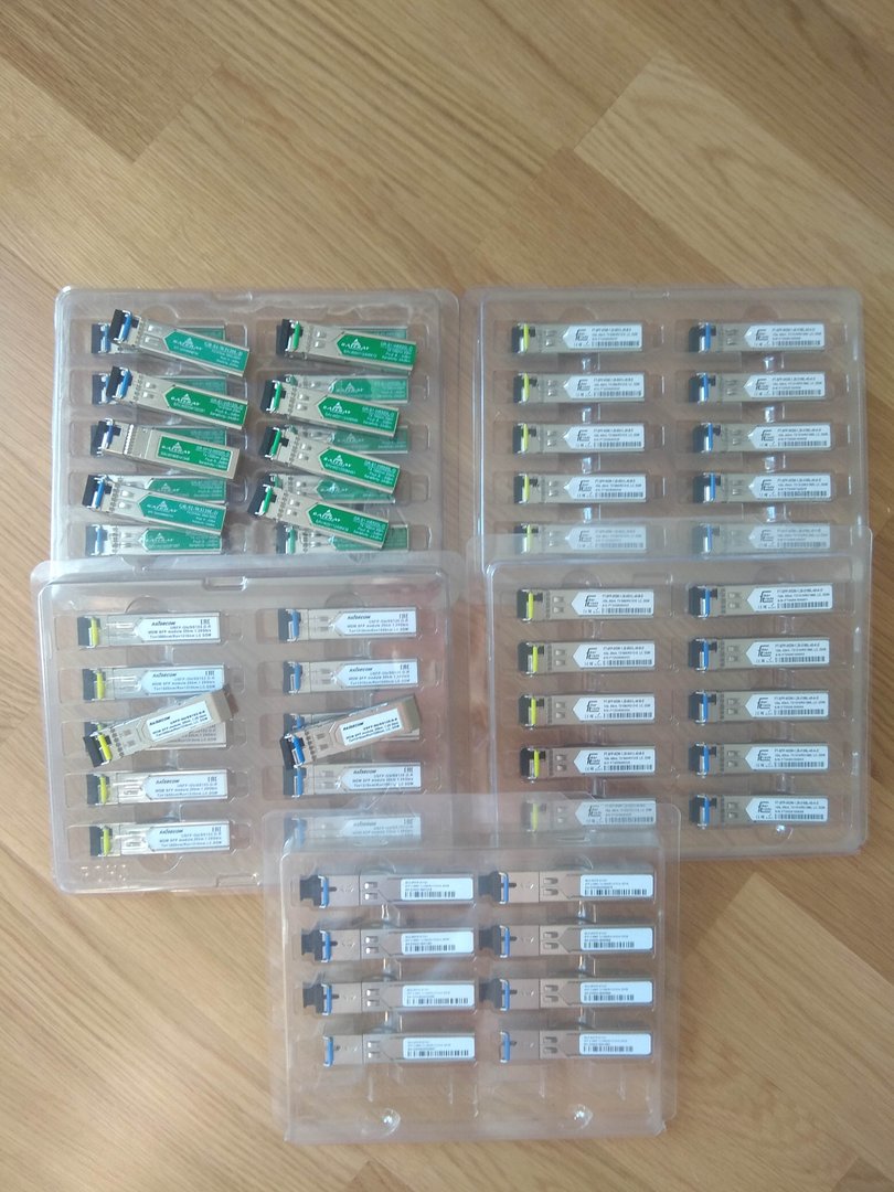 baslim80 Posted July 25, 2021 Posted July 25, 2021 1. SFP LC (25 готовых пар, новые) Gateray (20км, 9 пар) 250р/шт GR-S1-W3120L-D GR-S1-W5520L-D Raisecom (20км, 6 пар) 250р/шт USFP-Gb/SS153-D-R USFP-Gb/SS153-D-R Fiber Trade (40км, 10 пар) 260р/шт FT-SFP-WDM-1.25-6631L-40-B-D FT-SFP-WDM-1.25-3166L-40-B-D 2. xPON - 3500р/шт 38J0-6537E-STH2+ 20км, 2.488G, 1490/1410, 8 шт 3. XFP - 100р/шт Б/у, состояние отличное, 15 шт, разные (CareLink, Finisar...), фото по запросу 4. Оптические кабели, пигтейлы (всего около 50 штук, новые) Отдам весь лот за 12000 руб SC-SC(APC) 1m - 6 SC-SC(APC) 1.5m - 2 SC-SC(APC) 3m - 1 SC-SC(UPC) (pair) 1m - 1 FC-FC 2m -2 FC-FC (pair) 1m -1 FC-SC(UPC) 2m -4 FC-SC(UPC) (pair) 3m -3 FC-LC(UPC) 1m -1 FC-LC(UPC) 5m -2 FC-LC(UPC) 10m -7 Пигтейлы: SC(UPC) 1m - 8 SC(UPC) 1.5m - 4 SC(APC) G652D 1m - 4 SC(APC) G657A 1m - 5 Находятся в Ижевске, доставка за ваш счет, удобным вам способом Иван, 9512048511 Вставить ник Quote