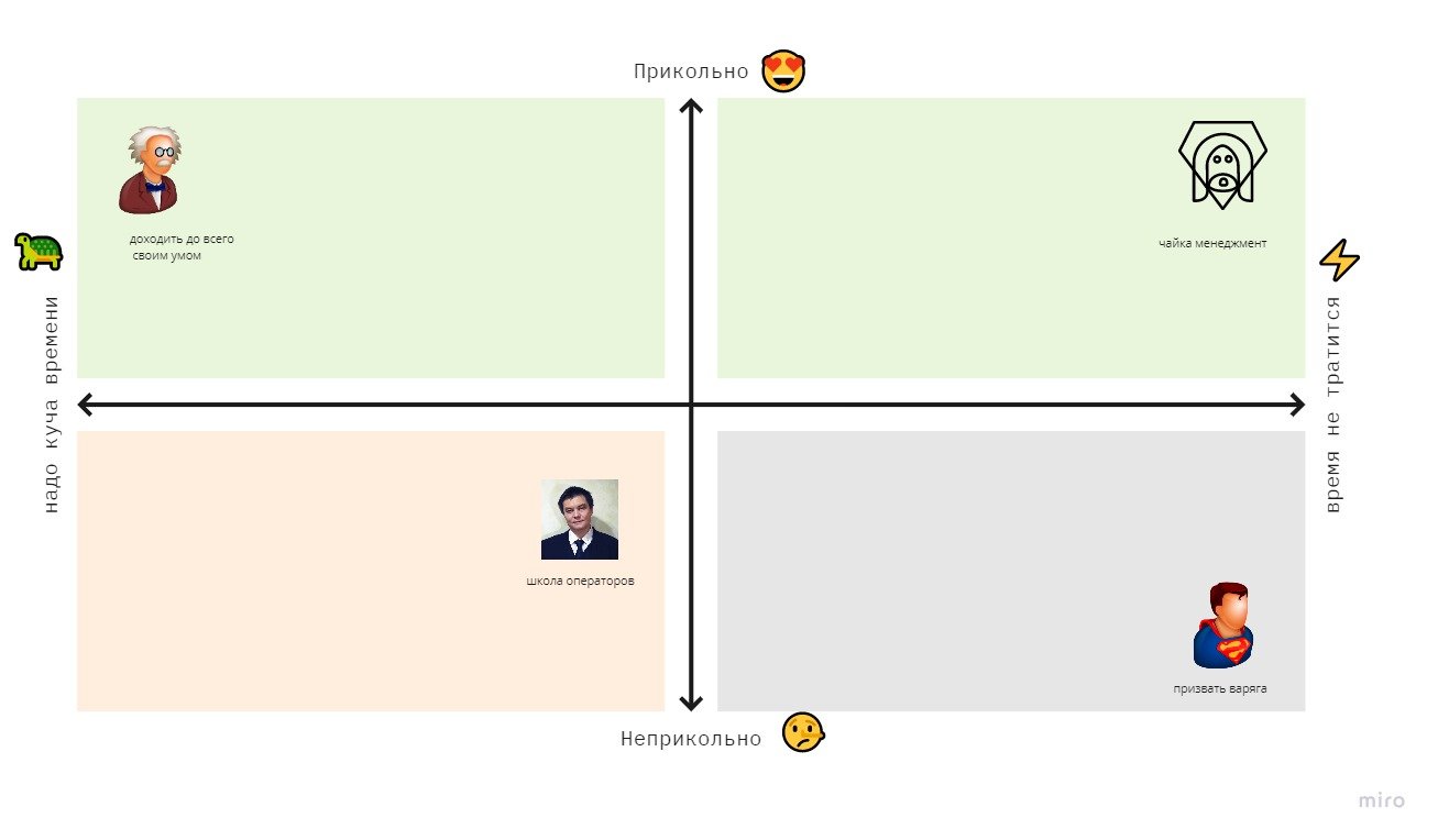 Тимур Posted August 27, 2021 Posted August 27, 2021 Чисто ради флуда. Допустим, вы интернет провайдер и перед вами стоит задача качественно развиваться. Осваивать новые практики, совершенствовать процессы. Вопрос - как это сделать оптимально? Давайте сравним разные варианты - как развивать организацию - чайка-менеджмент - саморазвитие по книгам - обмен идеями на конференциях - абстрактные онлайн-школы - привлечение гуру-консалтера - призвание варягов - крутой руководитель со стороны - программа КДО в Практике Продаж - он-лайн интенсивы в Школе Операторов Я тут в MIRO набросал поле для сравнения вариантов. Сравнивал по критериям - cтоимость и эффективность. В комментах выложу ссылку на MIRO доску - вы можете собрать свою картинку. Я вот нарисовал такую. И попробую ее сейчас обосновать. 1) Наш любимый Чайка-Менеджмент. Это когда руководитель иногда налетает на собственную организацию и начинает чего-то от сотрудников хотеть. Мы все умеем играть в эту игру. Все понимаем как дорого она обходится фирме. Как мало результатов это дает. Но блин, как руководитель в завязке скажу - это безусловно самый дорогой, самый неэффективный, но самый приятный способ. 2) Саморазвитие. Есть куча книг. Роликов в интернете. Можно в конце концов, !"думать своей головой". Ведь у нас есть "так называемая практическая сметка, плюс так называемый здравый смысл" (с) При этом мы практически не тратим денег. Но получаем ли мы результаты? Все очень просто - вы можете сравнить состояние своей организации на сейчас и скажем на пять лет назад. Есть много изменений в лучшую сторону? Поздравляю - вы молодец. Передвигайте квадратик по шкале эффективности туда, куда считаете правильно. Если же, например, за пять лет, у вас ничего не поменялось, то упс 3) Обмен идеями на конференциях Лично я фанат конференций. И слова худого не скажу. Но есть одно но - кто обычно приезжает на конференции? Руководители. А в чьем развитии мы больше всего нуждаемся? В развитии мидлов. Спорить будем? Нормальная ситуация - ты возвращаешься с конференции с ворохом идей и контактов, приходишь на работу, в болото плюх и опять до следующего года. Ядром компании являются управленцы среднего звена. Их и надо в первую очередь развивать. Но кто же их на конференции-то повезет? 4) Абстрактные онлайн школы Худого слова не скажу про он-лайн школы. Я сам фанат Продакт Юнивесити. Но в групповом он-лайн обучении есть один неисправимый косяк - "часы, трусы и макароны". Все материалы, которые вам дают - скорее всего хрен знает как их вообще применить к вашим реалиям. То есть так-то все понятно. Но что конкретно делать - неясно. Если у вас есть в компании человек с мозгами, который может пойти в онлайн школу, и суметь интерпретировать программу к вашим отраслевым реалиям, то вам очень повезло. У вас в компании есть бриллиантовый человек 5) Призвание гуру-консалтеров Опять же. Огульно критиковать не буду. Среди вольных консалтеров полно толковых людей. И работа с ними может принести пользу, но есть одно но. Те, которые по настоящему крутые - они капец дорогие и востребованные. Те, которые попроще, скорее всего качественно не отличаются от вашего текущего менеджмента. Но вам придется еще потратить кучу сил, чтобы объяснить что тут к чему. Короче, я сторонник отраслевой специализации в консалтинге, штонигавари. А то получается, что ты тратишь большие деньги, чтобы оч