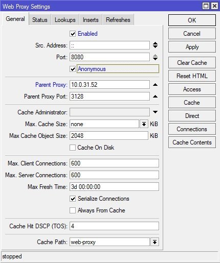 kex809 Posted March 24, 2022 Posted March 24, 2022 доброго всем дня! подскажите пожалуйста, как настроить роутер, для прозрачного прокси. Что бы от провайдера настройки прописать в роутере, а на АРП пользователей этого делать не нужно было. наши настройки от провайдера: Подсеть выданная провайдером: 10.31.81.0/24 Маска: 255.255.255.0 Шлюз: 10.31.78.1 прокси от провайдера 10.0.31.52 3128 делал такие настройки, как на скрине, и пропиывал правила в фаерволе: /ip firewall nat add chain=dstnat protocol=tcp dst-port=80 action=redirect to-addresses=10.0.31.52 to-ports=3128 /ip firewall nat add chain=dstnat protocol=tcp dst-port=443 action=redirect to-addresses=10.0.31.52 to-ports=3128 результыта нет Вставить ник Quote