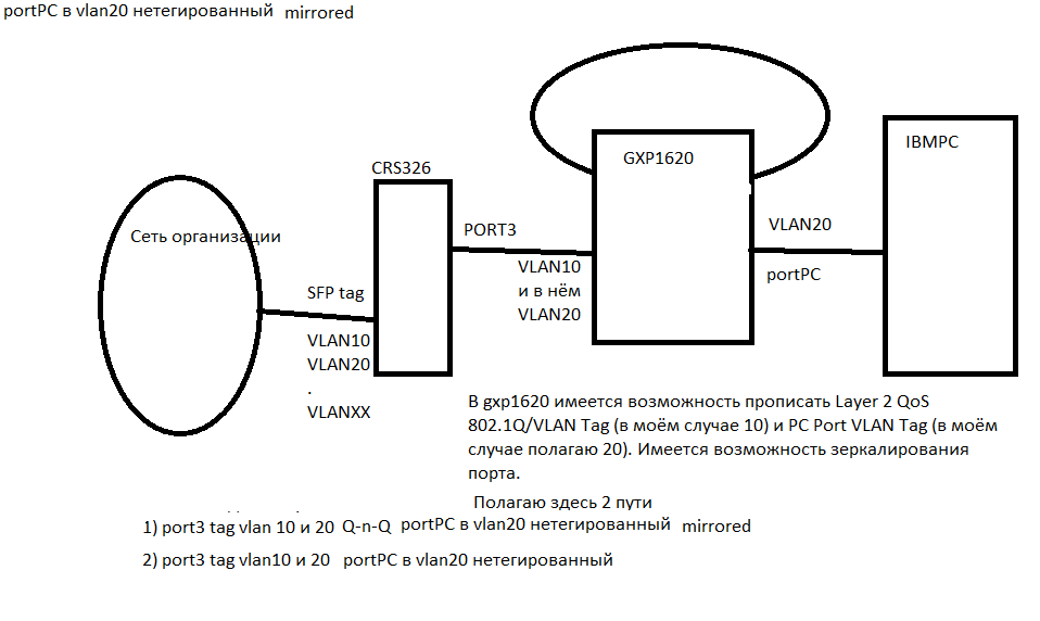 eoleg Posted March 30, 2022 Author Posted March 30, 2022 В 30.03.2022 в 18:53, SUrov_IBM сказал: Eoleg, здравствуйте. Если правильно понял Вашу схему: (сеть предприятия)<=VLAN ID 10 (tag); VLAN ID 20 (tag)=>[Switch CRS326]<=VLAN ID 10 (Untag(Native))=>[VoIP ТА GXP1620] Не совсем понятно, на каком участке у Вас возникли сложности? По сути, самый простой вариант - с 10го порта коммутатора, в сторону ТА отправить tagged VLAN ID 10 и VLAN ID 20. Со стороны ТА, VLAN ID 10 закрепить за самим ТА для VoIP, а tag VLAN ID 20 назначить на PC-порт ТА, чтобы на ibmpc поступал нетегированный (Native) трафик. Здравствуйте! Вот так Может ещё как то? Вставить ник Quote