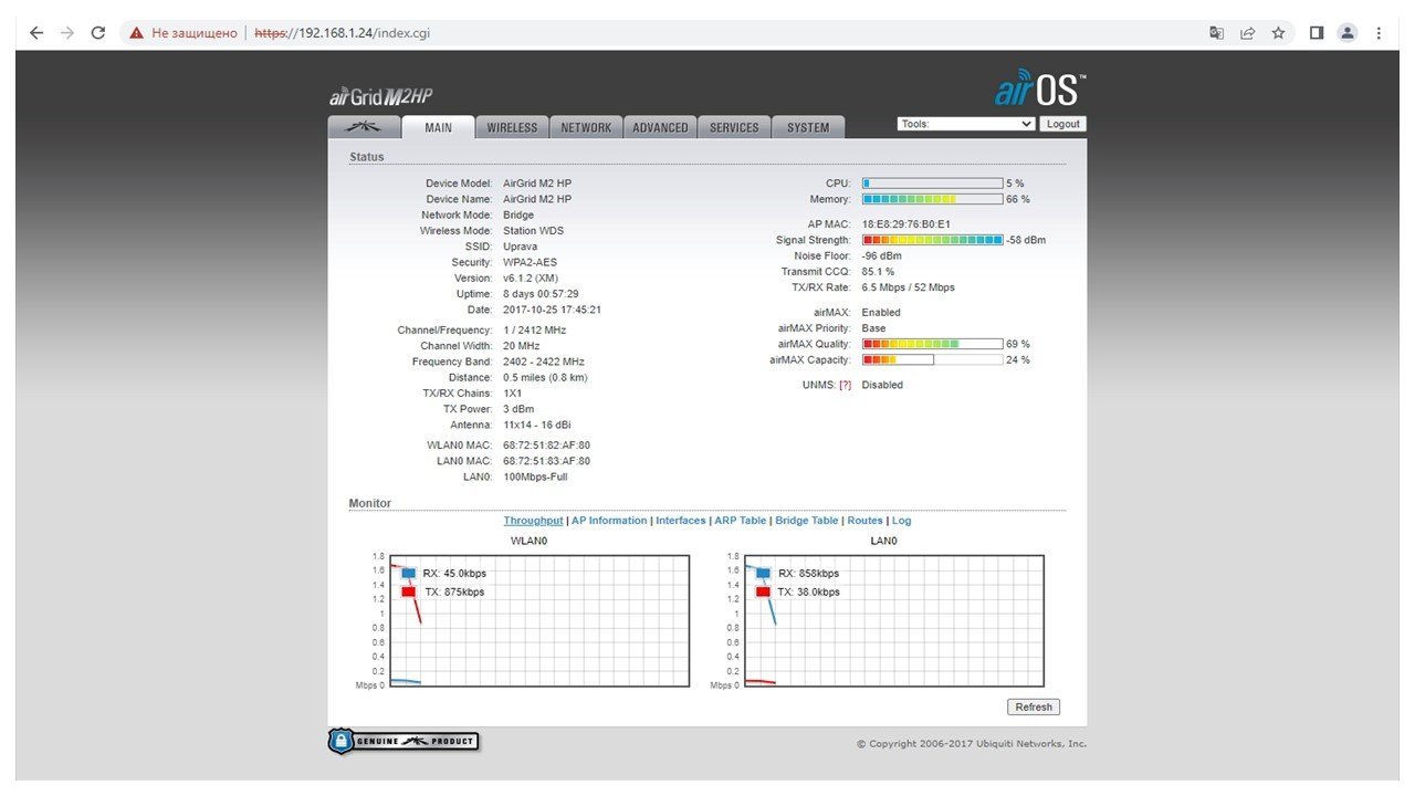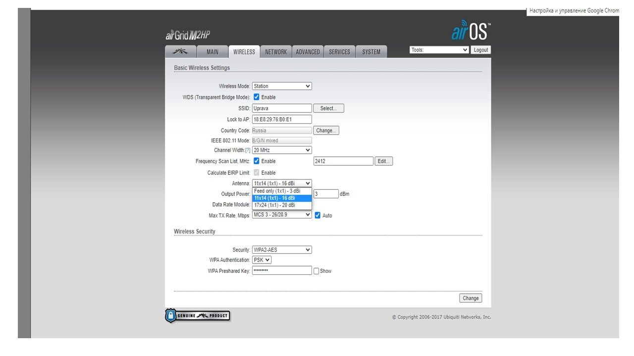 Миг29 Posted August 1, 2022 Всем привет. Купил недавно Ubiquiti AirGrid M2 HP 2G16. Добавил в существующую сеть. База Rocket M2. Расстояние с километр. Работает через пень. Эфир не грязный. Еще четыре работают великолепно. Меня смутило в настройках беспроводной сети вот такая картинка в пункте Антенна 11х14 (1Х1)-16 dbi. Вопрос ? Не понял почему (1х1) ? Не на одном железе за 17 лет с таким не сталкивался. И на М2 и М5 TX/RX Chains:2х2. Фото прилагаю. Может кто подскажет. Share this post Link to post Share on other sites More sharing options...