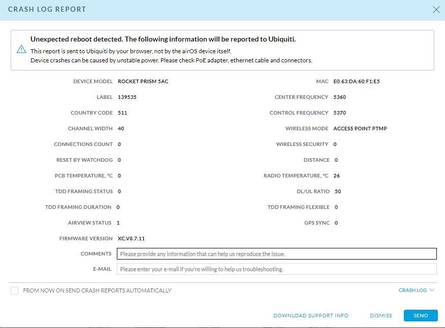 Opium38 Posted January 24, 2023 Posted January 24, 2023 Помогите, кто сталкивался и решил подобную проблему: Имеем несколько антенн одинаковых (прошивка тоже). Каждый год в морозы ниже -35 имеем хаотичный по времени и локации ребут антенна. Может каждые 5 мин, может сутки работать. Меняли блоки, магистрали. Не помогает ничего (было что после замены магистрали работало несколько часов и снова падения). При том, что стоят на AirPrism по 3 шт, и одна может перезагружаться, на других локациях нет (замены местами магистралей с блоками местами, не решает проблему, в отваливается та, что и раньше). Остается только сама голова, но это не решение вопроса, а мера устранения. Хочется понять проблему и исключить ее в будущем. Если нужны какие то данные - докину. Сегодня морозы спали до -28, и все сразу работает отлично ROCKET PRISM 5AC | XC.V8.7.11 XC-e063dad0f23d.sup XW-24A43C9A1F0B.sup Вставить ник Quote
