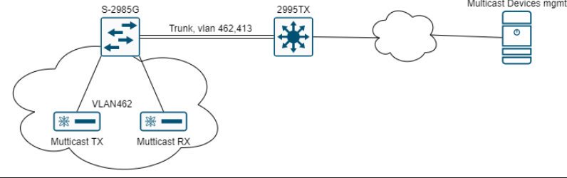 sorokin.a Posted February 15, 2023 Добрый день. Есть примерно вот такая схема Два свитча, 2985 и 2995. К 2985 подключены девайсы для передачи видео мультикастом. Требование - между ними, должно быть mtu 9216 или выше Свитч 2995 терминирует вланы для этих устройств и менеджмент влан свитча. На 2985 нашел только глобальную опцию config>mtu 9216. Но тогда соответственно, на линке между свитчами начинается твориться хаос и input error На цисках судя по всему просто ставиться mtu на интерфейс и все. Как быть с SNR? Варианты с заменой оборудования понятно, но желательно без этого. Share this post Link to post Share on other sites More sharing options...
