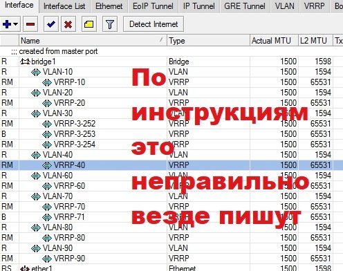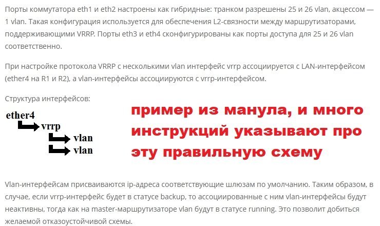 SLAVCHIKS Posted March 6, 2023 Author Posted March 6, 2023 (edited) по старинке создавать на бридже vlan ? Hardware offload не задействовать? Суть моего вопроса вот в чем в старых версиях создавал bridge на нем потом vlan а потом на уже на vlan вешал vrrp, и они были как шлюзы на роутере 1 присваиваю адрес на порт ether1 - 192.168.3.101 создаю на нем vrrp-ether1 приоритет 254 присваиваю адрес- 192.168.3.251/32 на vrrp создаю два vlan vlan10-vrrp1 присваиваю ему адрес 192.168.0.254 vlan30-vrrp1 присваиваю ему адрес 192.168.3.254 на роутере 2 присваиваю адрес на порт ether1 - 192.168.3.102 создаю на нем vrrp-ether1 приоритет 150 присваиваю адрес- 192.168.3.251/32 на vrrp создаю два vlan vlan10-vrrp1 присваиваю ему адрес 192.168.0.254 vlan30-vrrp1 присваиваю ему адрес 192.168.3.254 на роутере 3 присваиваю адрес на порт ether1 - 192.168.3.103 создаю на нем vrrp-ether1 приоритет 50 присваиваю адрес- 192.168.3.251/32 на vrrp создаю два vlan vlan10-vrrp1 присваиваю ему адрес 192.168.0.254 vlan30-vrrp1 присваиваю ему адрес 192.168.3.254 в такой схеме получается на мастере появляется тегированный транк vlan 10+30 с двумя шлюзами для каждой подсети в каждом vlan остальные роутеры в это время уходят в бекап и видится только адрес на порту, через который взаимодействует vrrp для проверки доступности в это время отключены, НО ТУТ НЮАНС а значит и проверка доступности портов ether1 отключается, нет vlan - нет связи, так как vlan отключается вместе с vrrp. В сети есть гайды что для видимости портов создают тут гибриды. Но это заморачивает схему, используют для их связи vlan1 как access в транке вопрос???? как в такой схеме сделать доступность друг другу портов, на которых навешен vrrp??? Например, если не задействуется бридж в микротиках, можно на коммутаторах, куда будет включены все концы vrrp с трех роутеров, настроить гибрид, но тогда тоже вопрос, если vrrp отключены на бекапе, то получается ether1 переходит в состояние vlan1, на том другом же роутере мастере, где поднимется vrrp, уже не будет доступен порт, так как появляются чистые два vlan тегированные прикреплю две картинки одна моя рабочая - которая считается типа неправильной, и вторая скрин из мануала в сети. Кто настраивал подобную схему прошу поделиться опытом, толковой инфы не нашел нигде. Edited March 6, 2023 by SLAVCHIKS Вставить ник Quote