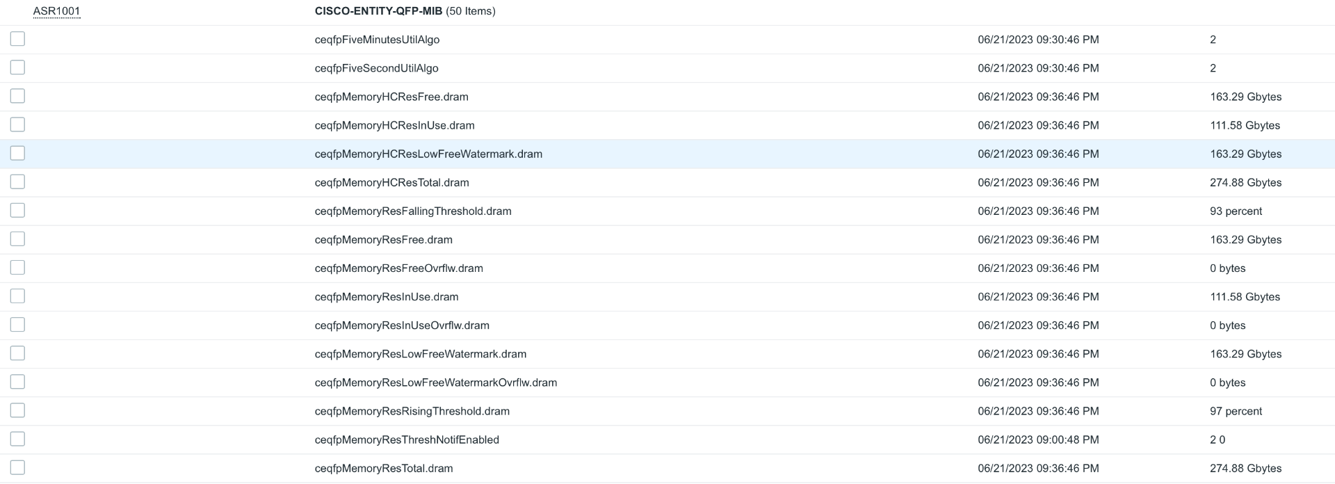 fractal Posted June 22, 2023 7 часов назад, sirmax сказал: 2. Полное непонимание как ASR отдает инфу о памяти по SNMP (CISCO-ENTITY-QFP-MIB) как выше написали в asr деление памяти, если Вы хотите смотреть physical memory (DRAM в RP). cisco ASR1001 (1RU) processor (revision 1RU) with 1067061K/6147K bytes of memory. Processor board ID SSI1642195Q 4 Gigabit Ethernet interfaces 32768K bytes of non-volatile configuration memory. 4194304K bytes of physical memory. 7741439K bytes of eUSB flash at bootflash:. то берете oid (множитель 1000, единица измерения b) FREE - .1.3.6.1.4.1.9.9.109.1.1.1.1.19.7 (CISCO-PROCESS-MIB::cpmCPUMemoryHCFree.7 = Counter64: 703268 kilo-bytes) USED - .1.3.6.1.4.1.9.9.109.1.1.1.1.17.7 (CISCO-PROCESS-MIB::cpmCPUMemoryHCUsed.7 = Counter64: 3271388 kilo-bytes) если хотите смотреть потребление QFP то там другие OID (DRAM в ESP) sh platform resources **State Acronym: H - Healthy, W - Warning, C - Critical Resource Usage Max Warning Critical State ---------------------------------------------------------------------------------------------------- RP0 (ok, active) H Control Processor 12.30% 100% 90% 95% H DRAM 3194MB(82%) 3881MB 90% 95% H ESP0(ok, active) H QFP H TCAM 36cells(0%) 65536cells 45% 55% H DRAM 154150KB(58%) 262144KB 80% 90% H IRAM 46704KB(35%) 131072KB 80% 90% H к примеру QFP=DRAM (я использую HC счетчики) без предобработки, единица измерения (b) ceqfpMemoryHCResTotal - 1.3.6.1.4.1.9.9.715.1.1.7.1.9 ceqfpMemoryHCResInUse - 1.3.6.1.4.1.9.9.715.1.1.7.1.11 ceqfpMemoryHCResFree - 1.3.6.1.4.1.9.9.715.1.1.7.1.13 По подсчету трафика - хорошая дока https://www.cisco.com/c/en/us/support/docs/routers/asr-1000-series-aggregation-services-routers/200674-Throughput-issues-on-ASR1000-Series-rout.html Вставить ник Quote Ответить с цитированием Share this post Link to post Share on other sites More sharing options...