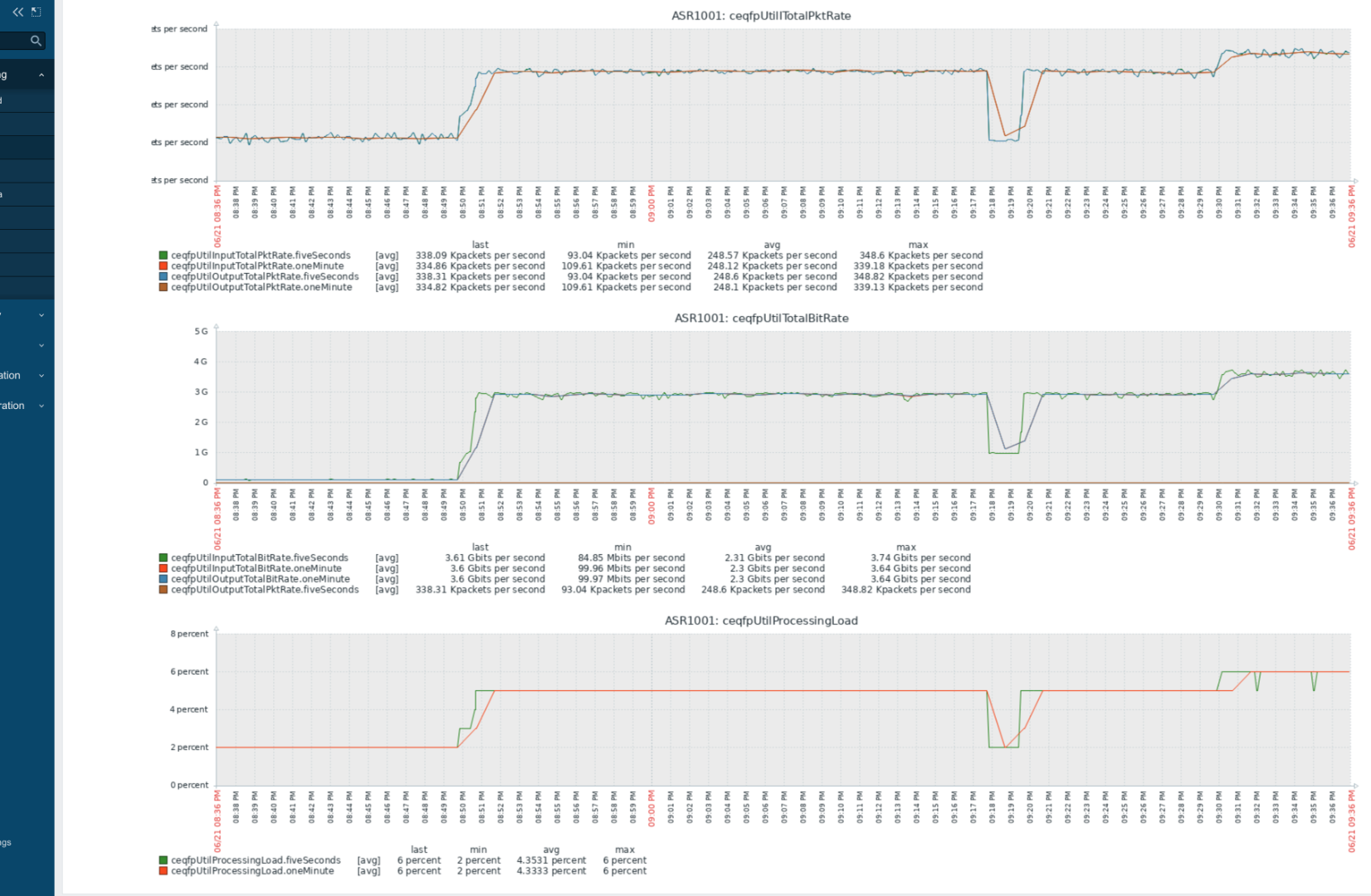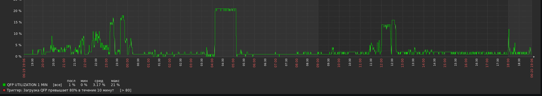 sirmax Posted June 21, 2023 17 часов назад, fractal сказал: по qfp беру .2, насколько помню это минута .1.3.6.1.4.1.9.9.715.1.1.6.1.14.9026.1 = Gauge32: 4 .1.3.6.1.4.1.9.9.715.1.1.6.1.14.9026.2 = Gauge32: 4 .1.3.6.1.4.1.9.9.715.1.1.6.1.14.9026.3 = Gauge32: 3 .1.3.6.1.4.1.9.9.715.1.1.6.1.14.9026.4 = Gauge32: 2 мне кажется нагрузка на qfp в зависимости от PPS, покажет наиболее точный результат в Вашем случае вот у меня нагрузка по шифрованию на скорости 1Gb (asr1001 без X) мне кажется нагрузка на qfp в зависимости от PPS, покажет наиболее точный результат в Вашем случае вот у меня нагрузка по шифрованию на скорости 1Gb сравнил графики, zabbix показал 989,56, netflow 934.83 Очень резонное замечание! Это CISCO-ENTITY-QFP-MIB Прежде чем продолжать тесты нужно сделать мониторинг параметров из него, запилю темплейт для заббикса (сходу готового не нагуглилось но там вроде все не сложно) Вставить ник Quote Ответить с цитированием Share this post Link to post Share on other sites More sharing options...