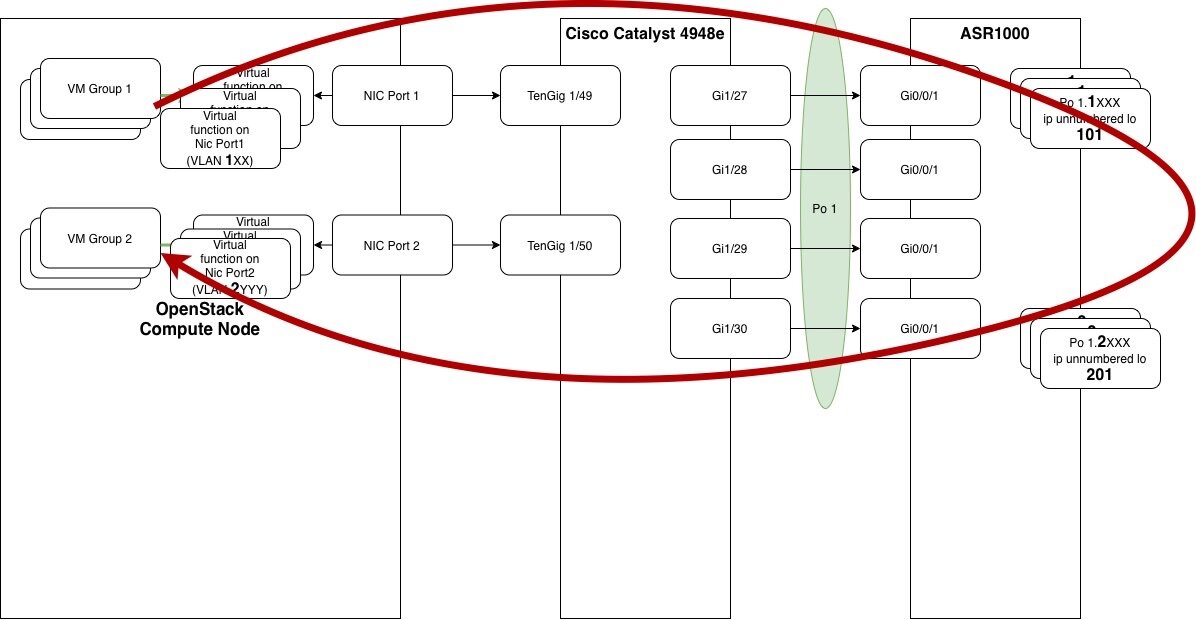 sirmax Posted June 20, 2023 1 час назад, fractal сказал: есть куда netflow слать? точнее будет Это лаба, железка включена в свитч с Compute Nodе опенстека, поднять виртуалку для нетфлоу не проблема (НО для отправки - только менеджмент порт, так как все 4 порта используются для тестирования, и я не уверен что так можно/правильно делать, вроде бы там есть вопросы с обработкой трафика процессором) Всего доступно для тестирования (сейчас) 64 виртуальных машины, на каждые 32 из них - 1 10 гиг порт, остальные карты без SR-IOV, и на них скорости не выйдет получить В тесте до того гонял трафик на 16 ВМках, 8 с одной стороны, 8 с другой, по 5 потоков. Сейчас пересоздам, по 32 с каждой стороны роуера примерно так выглядит схема - ВМки из вланов 201-132 терминируются на ASR на Po1.101-132 (ip unnumbered lo 101) - ВМки из вланов 201-232 терминируются на ASR на Po1.201-232 (ip unnumbered lo 201) Между ними просто маршрутизация без ната/ACL/еще чего-то 1 час назад, fractal сказал: а zabbix как часто опрашивает? 1 час назад, fractal сказал: (qfp за минуту усредняет, хотя по идее если трафик шел минут 10 ровный то должно совпасть) Та тест минимум на час запускается, и да на графиках все ровно Вставить ник Quote Ответить с цитированием Share this post Link to post Share on other sites More sharing options...