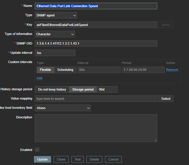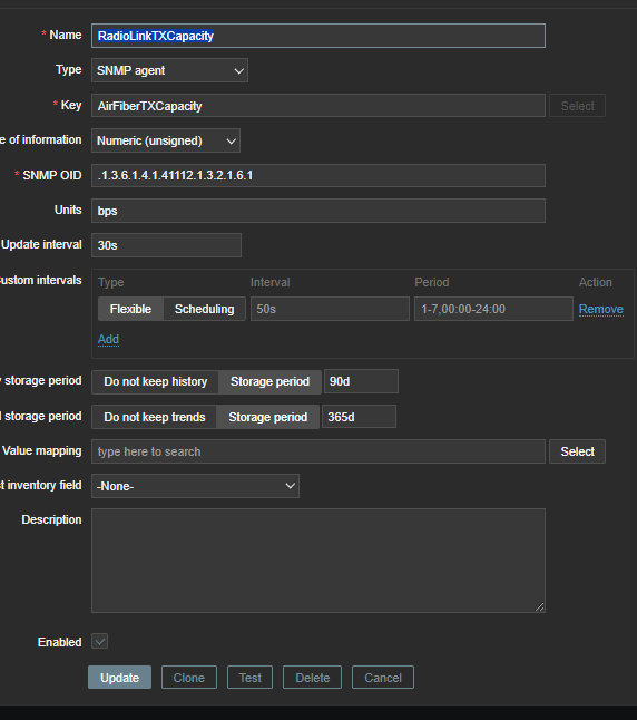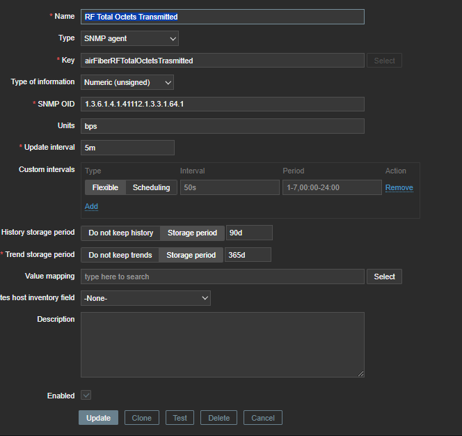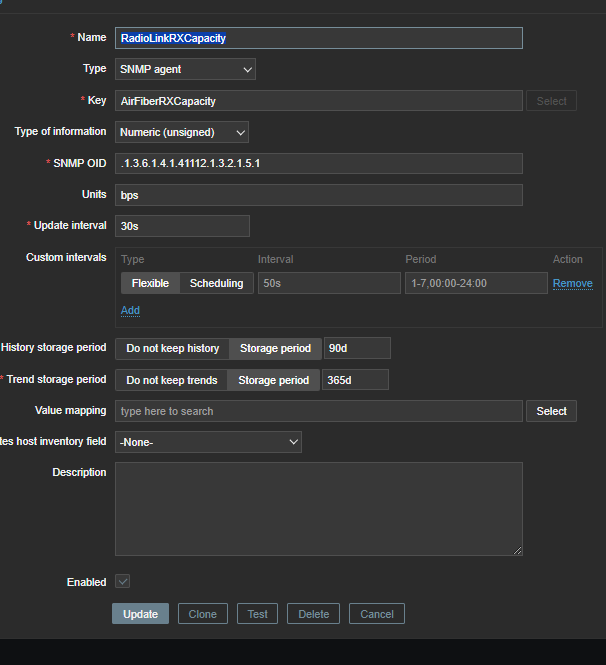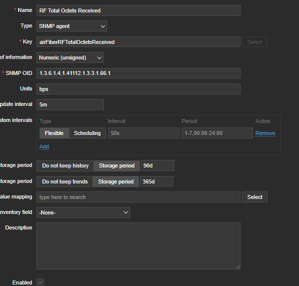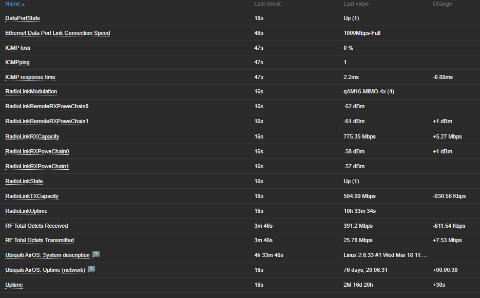 s.orynbai Posted August 18, 2023 (edited) Подскажите OID/key Throughput RX/TX от AirFiber 11 или 24? и по discovery rule net interface вытаскивает speed management порта файбера 10 Mbps. Мне нужен speed data порта. Кто сталкивался Мне доступен только для airFiber60 1.3.6.1.4.1.41112.1.11.1.3.1.9.{#SNMPINDEX} Throughput TX 1.3.6.1.4.1.41112.1.11.1.3.1.10.{#SNMPINDEX} Throughput RX Edited August 21, 2023 by s.orynbai Share this post Link to post Share on other sites More sharing options...