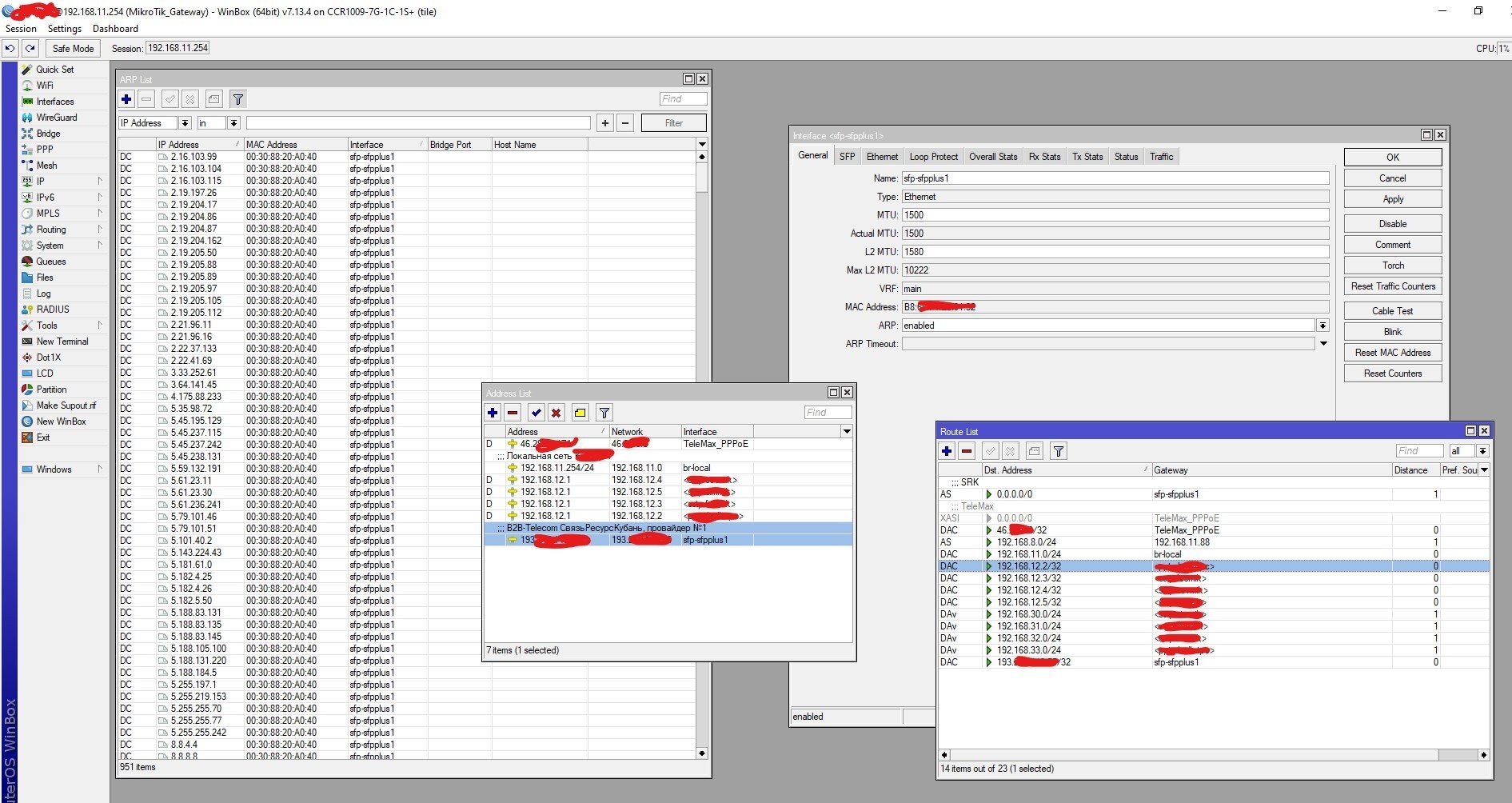VladOst Posted February 15, 2024 (edited) Сразу скажу, что proxy-ARP не только на интерфейсе, а на всём MT не применяется, везде только enabled - проверил! CCR1009-7G-1C-1S+ (v7.13.4). В SFP порт (отдельный, не комбо) вставлен модуль, и по ВОЛС в него приходит Инет от провайдера. Белый IP. При сёрфе все публичные IP, к которым обращаются пользователи локалки, оседают в ARP таблице. Пробовал её всю почистить, естественно, не помогло - тут же оседают снова. Обратите внимание, в ARP таблице для всех "этих внешних" IP один MAC, и это не MAC моего интерфейса sfp-sfpplus1. Полагаю, что это MAC порта на стороне провайдера. В таблице так же есть и мои локальные IP, со своими корректными MAC, по ним вопросов нет. Есть мысли? Уже весь мозг сломал... Edited February 15, 2024 by VladOst Share this post Link to post Share on other sites More sharing options...