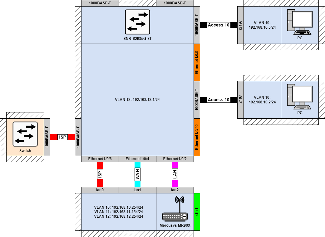 vladislove Posted August 20, 2024 Posted August 20, 2024 (edited) Здравствуйте. Подскажите как реализовать схему на коммутаторе SNR-S2985G-8T с разделением трафика по портам на основе ip-dst. Имеется роутер с OpenWrt, его порты lan1 и lan2 подключены к портам коммутатора 1/0/4 и 1/0/2 соответственно. На коммутаторе оба порта имеют одинаковые настройки: switchport mode hybrid switchport hybrid allowed vlan 10-12 tag На роутере VLAN 10-12 также прописаны тегом на оба порта. Конечные устройства на коммутаторе имеют ip 192.168.10.0/24 и VLAN 10 Access, прикрепил схему. Нужно сделать так, чтобы на порт 1/0/2 ходил трафик только с ip-dst 192.168.0.0/16, а на порт 1/0/4 любой трафик, кроме ip-dst 192.168.0.0/16 Попробовал сделать ip access-list: ! ip access-list extended LAN_Only permit ip any-source 192.168.0.0 0.0.255.255 deny ip any-source any-destination exit ip access-list extended WAN_Only deny ip any-source 192.168.0.0 0.0.255.255 permit ip any-source any-destination exit ! ! Interface Ethernet1/0/2 description <<<LAN_MR90X_lan2 switchport mode hybrid switchport hybrid allowed vlan 10-12 tag ip access-group LAN_Only in traffic-statistic ! ! Interface Ethernet1/0/4 description <<<WAN_MR90X_lan1 switchport mode hybrid switchport hybrid allowed vlan 10-12 tag ip access-group WAN_Only in traffic-statistic ! isolate-port group 1 switchport interface Ethernet1/0/4 isolate-port group 1 switchport interface Ethernet1/0/2 Пингую внешний и внутренний ip с компьютера 192.168.10.5, трафик всё равно ходит через один порт: root@MR90X:/# tcpdump -i any host 192.168.10.5 and icmp -n -q tcpdump: data link type LINUX_SLL2 tcpdump: verbose output suppressed, use -v[v]... for full protocol decode listening on any, link-type LINUX_SLL2 (Linux cooked v2), snapshot length 262144 bytes 22:17:15.636927 lan2 P IP 192.168.10.5 > 8.8.8.8: ICMP echo request, id 1, seq 1, length 40 22:17:15.636927 br-lan In IP 192.168.10.5 > 8.8.8.8: ICMP echo request, id 1, seq 1, length 40 22:17:15.636927 br-lan.10 In IP 192.168.10.5 > 8.8.8.8: ICMP echo request, id 1, seq 1, length 40 22:17:15.691893 br-lan.10 Out IP 8.8.8.8 > 192.168.10.5: ICMP echo reply, id 1, seq 1, length 40 22:17:27.593058 lan2 P IP 192.168.10.5 > 192.168.12.1: ICMP echo request, id 1, seq 2, length 40 22:17:27.593058 br-lan In IP 192.168.10.5 > 192.168.12.1: ICMP echo request, id 1, seq 2, length 40 22:17:27.593058 br-lan.10 In IP 192.168.10.5 > 192.168.12.1: ICMP echo request, id 1, seq 2, length 40 22:17:27.593138 br-lan.12 Out IP 192.168.10.5 > 192.168.12.1: ICMP echo request, id 1, seq 2, length 40 22:17:27.599076 lan2 P IP 192.168.12.1 > 192.168.10.5: ICMP echo reply, id 1, seq 2, length 40 22:17:27.599076 br-lan In IP 192.168.12.1 > 192.168.10.5: ICMP echo reply, id 1, seq 2, length 40 22:17:27.599076 br-lan.12 In IP 192.168.12.1 > 192.168.10.5: ICMP echo reply, id 1, seq 2, length 40 22:17:27.599107 br-lan.10 Out IP 192.168.12.1 > 192.168.10.5: ICMP echo reply, id 1, seq 2, length 40 Edited August 21, 2024 by vladislove На схеме была небольшая ошибка Вставить ник Quote