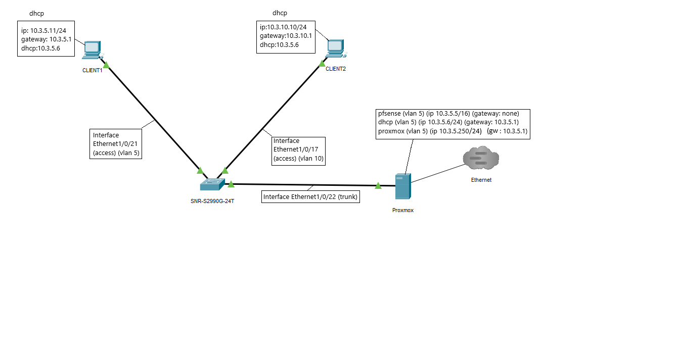 fiveqp24 Posted December 3, 2024 Posted December 3, 2024 (edited) Добрый день, пытаюсь настроить 2990g, коммутатор один, к нему подключен сервер proxmox, на котором висит две виртуалки pfsense (lan ip 10.3.5.5) (5 влан) и winserver (lan ip 10.3.5.6) (dhcp) (5 влан), сервер подключен к 22 транковому порту. При таком подключении в 5 влане, dhcp выдаёт адрес на клиента, pfsense пингуется и собственно интернет есть. В 10 влане dhcp не выдаёт адреса(пинг есть), pfsense не пингуется. Хотелось что бы и в 10 влане всё работало. Собственно вопрос в том, дело в настройках коммутатора или в чём то другом? Пример конфигурации: Скрытый текст ! no service password-encryption ! hostname SNR-S2990G-24T sysLocation Building 57/2,Predelnaya st, Ekaterinburg, Russia sysContact support@nag.ru ! authentication logging enable ! username admin privilege 15 password 0 admin ! authentication line console login local ! ! ! ip fib optimize ! ! ! ssh-server enable ! ip forward-protocol udp bootps ip dhcp relay information option ! ! ! ! ! spanning-tree ! ! ! Interface Ethernet0 ! ! ! vlan 1;3;5;10 ! Interface Ethernet1/0/1 ! Interface Ethernet1/0/2 ! Interface Ethernet1/0/3 ! Interface Ethernet1/0/4 ! Interface Ethernet1/0/5 ! Interface Ethernet1/0/6 ! Interface Ethernet1/0/7 ! Interface Ethernet1/0/8 ! Interface Ethernet1/0/9 ! Interface Ethernet1/0/10 ! Interface Ethernet1/0/11 ! Interface Ethernet1/0/12 ! Interface Ethernet1/0/13 ! Interface Ethernet1/0/14 ! Interface Ethernet1/0/15 ! Interface Ethernet1/0/16 ! Interface Ethernet1/0/17 switchport access vlan 10 ! Interface Ethernet1/0/18 switchport access vlan 10 ! Interface Ethernet1/0/19 switchport access vlan 10 ! Interface Ethernet1/0/20 switchport access vlan 10 ! Interface Ethernet1/0/21 switchport access vlan 5 ! Interface Ethernet1/0/22 switchport mode trunk ! Interface Ethernet1/0/23 switchport access vlan 5 ! Interface Ethernet1/0/24 switchport access vlan 5 ! Interface Ethernet1/0/25 ! Interface Ethernet1/0/26 ! Interface Ethernet1/0/27 ! Interface Ethernet1/0/28 ! interface Vlan1 ip address 192.168.1.1 255.255.255.0 ! interface Vlan5 ip address 10.3.5.1 255.255.255.0 !forward protocol udp 67(active)! ip helper-address 10.3.5.6 ! interface Vlan10 ip address 10.3.10.1 255.255.255.0 !forward protocol udp 67(active)! ip helper-address 10.3.5.6 ! router rip ! ip route 0.0.0.0/0 10.3.5.5 ! ! no login ! captive-portal ! end pfsense, dhcp настраиваю по аналогии c рабочей конфигурации в ней стоит cisco 3560x, там это работает. Пример: Скрытый текст ! version 12.2 no service pad service timestamps debug datetime msec service timestamps log datetime msec service password-encryption ! hostname Switch ! boot-start-marker boot-end-marker ! aaa new-model ! ! ! ! ! aaa session-id common system mtu routing 1500 ip routing ! spanning-tree mode pvst spanning-tree extend system-id auto qos srnd4 ! ! ! ! vlan internal allocation policy ascending ! ! ! interface FastEthernet0 no ip address no ip route-cache cef no ip route-cache no ip mroute-cache ! interface GigabitEthernet0/1 switchport access vlan 777 switchport mode access spanning-tree bpdufilter enable ! interface GigabitEthernet0/2 switchport access vlan 777 switchport mode access spanning-tree bpdufilter enable ! interface GigabitEthernet0/3 switchport access vlan 777 switchport mode access spanning-tree bpdufilter enable ! interface GigabitEthernet0/4 switchport access vlan 777 switchport mode access spanning-tree bpdufilter enable ! interface GigabitEthernet0/5 switchport access vlan 777 switchport mode access spanning-tree bpdufilter enable ! interface GigabitEthernet0/6 switchport access vlan 777 switchport mode access spanning-tree bpdufilter enable ! interface GigabitEthernet0/7 switchport trunk encapsulation dot1q switchport trunk native vlan 111 switchport mode trunk ! interface GigabitEthernet0/8 switchport trunk encapsulation dot1q switchport trunk native vlan 111 switchport mode trunk ! interface GigabitEthernet0/9 switchport trunk encapsulation dot1q switchport mode trunk ! interface GigabitEthernet0/10 switchport trunk encapsulation dot1q switchport mode trunk ! interface GigabitEthernet0/11 switchport access vlan 111 switchport mode access ! interface GigabitEthernet0/12 switchport access vlan 111 switchport mode access ! interface GigabitEthernet0/13 switchport access vlan 111 switchport mode access ! interface GigabitEthernet0/14 switchport access vlan 111 switchport mode access ! interface GigabitEthernet0/15 switchport access vlan 111 switchport mode access ! interface GigabitEthernet0/16 switchport access vlan 111 switchport mode access ! interface GigabitEthernet0/17 switchport access vlan 101 switchport mode access ! interface GigabitEthernet0/18 switchport access vlan 101 switchport mode access ! interface GigabitEthernet0/19 switchport access vlan 102 switchport mode access ! interface GigabitEthernet0/20 switchport access vlan 102 switchport mode access ! interface GigabitEthernet0/21 switchport access vlan 105 switchport mode access ! interface GigabitEthernet0/22 switchport access vlan 105 switchport mode access ! interface GigabitEthernet0/23 switchport access vlan 107 switchport mode access ! interface GigabitEthernet0/24 switchport access vlan 107 switchport mode access ! interface GigabitEthernet1/1 ! interface GigabitEthernet1/2 ! interface GigabitEthernet1/3 ! interface GigabitEthernet1/4 ! interface TenGigabitEthernet1/1 ! interface TenGigabitEthernet1/2 ! interface Vlan1 ip address 192.168.1.2 255.255.255.0 ! interface Vlan101 ip address 10.2.10