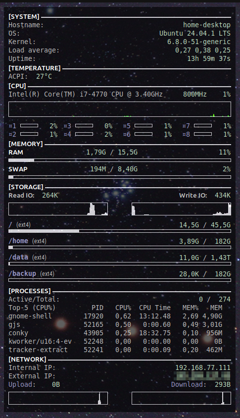 alibek Posted December 29, 2024 Author Posted December 29, 2024 Цитата вылет может случится при резких изменениях в выводе, Ну так я пока конфиг отлаживал, каждое третье сохранение вылетал. Цитата Glances Посмотрю, но это вроде бы совсем другое. Это утилита, которая в своем окне выводит информацию. Соответственно ее нужно запускать, например в screen. А conky рисует поверх десктопа, типа наложение на обои, но динамическое. Вставить ник Quote