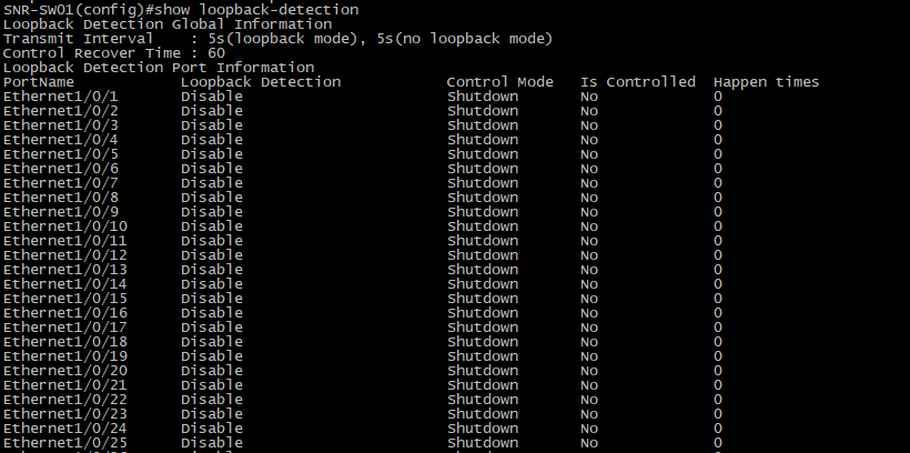DonKarson Posted April 7 (edited) Столкнулся с проблемой при настройке Loopback Detection на коммутаторе SNR-S2989G-48TX-POE с прошивкой V705R002C008. Цель — включить LBD на портах и настроить автоматическое восстановление после устранения петли. В режиме глобальной конфигурации команда loopback-detection enable отсутствует. На портах использую следующие команды: interface range Ethernet 1/0/1 to 1/0/48 loopback-detection control shutdown loopback-detection specified-vlan 1 После этого show loopback-detection показывает, что Detection всё ещё в статусе Disable. Пробовал также: loopback-detection send packet ? loopback-detection send packet ? Но CLI не принимает ни одно значение (1, 3, lldp, 99 и т.д.), везде ошибка: % Invalid input detected at '^' marker. Вопроса, как правильно включить Loopback Detection в данной прошивке? Edited April 7 by DonKarson Share this post Link to post Share on other sites More sharing options...