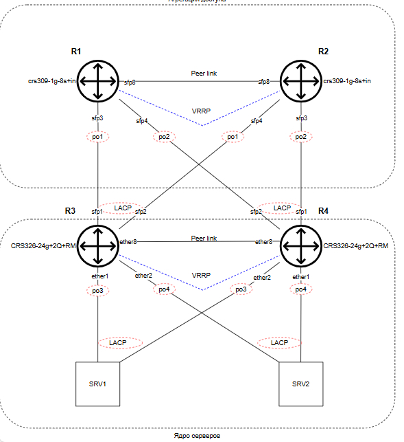 immortalfly Posted April 8 Доброго дня. Помогите мне разобраться в проблеме и направьте на путь истинный. Имеем собранный демостенд который состоит из агрегации доступа и агрегации серверов. Хочу сделать двухуровневый MLAG благо данные железки это могут, но не выходит "каменный цветок". Что делаю я - собираю R1 и R2 в режиме MLAG. На интерфейсе sfp3 R1 создаю bond в режиме 802.3.ad и присваиваю ему идентификатор MLAG1, а на интерфейсе sfp4 аналогичный bond, но с идентификатором MLAG2. Аналогичные действия провожу на R2 только на sfp4 накидываю бонд с идентификатором MLAG1 а на sfp3 c идетнификатором MLAG2. На R1 и R2 cоздаю мосты присваиваю им одинаковый приоритет ну пусть будет 1000 и включаю протокол RSTP. В этот мост добавляю созданные бонды и интерфейс для peer link в моем случае sfp8. На коммутаторах ядра серверов R3 и R4 создаю мосты с идентификатором отличным от верхней пары коммутаторов пусть будет 2000 и включаю протокол RSTP. Объединяю sfp1 и sfp2 в bond в режиме 802.3.ad на каждом коммутаторе и добавляем в соответствующие bridge, аналогично добавляем интерфейс для peer link ether8. Теперь на R1 и R2 R3 и R4 создаю vlan пусть будет 4 для транзитной сети между агрегацией доступа и ядром серверов и накидываю на него адресацию из подсети пусть будет 10.10.10.0/29 Делаю тегированным данный Vlan на bond интерфейсах peer link и самом бридже. На R1 и R2 для peer port присваиваем нетегированный vlan50. Теперь дело за малым - включаю фильтрацию vlan на мосту и собираю сам MLAG где peer port это sfp8. Вешаю интерфейс vrrp на 4 vlan R1 и R2 и даю ему адресацию после этого проверяю доступность и отказоустойчивость включая и выключая оборудование и дергая линки. Все работает!! Но как только начинаю собирать вторую пару MLAG коммутаторов R3 R4 то протокол RSTP начинает детектить петли и отключать интерфейсы. И как итог получаем не рабочую сеть. Как корректно собрать данную связку на представленном оборудовании? Пробовал включать edge port на bond портах R3 и R4 это не дало результата. Share this post Link to post Share on other sites More sharing options...