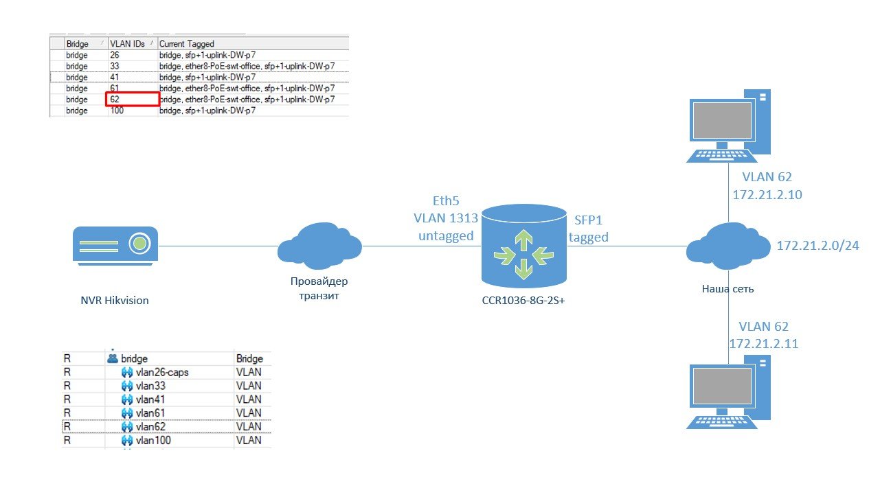 Tooreagen Posted July 28 (edited) Все привет! Подскажите как организовать: Есть mikrotik CCR1036. На интерфейсе bridge висит интерфейс VLAN с id=62, в порт eth5 вставлен кабель клиента, на порту untagged VLAN 1313. В VLAN 62 назначена сеть 172.21.2.0/24, мне нужно на порт eth5 разрешить доступ только к нескольким хостам из 172.21.2.0/24. Как это сделать? Edited July 28 by Tooreagen дописал задачу Share this post Link to post Share on other sites More sharing options...