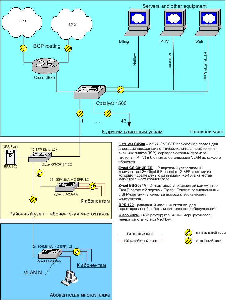 vIv Posted June 28, 2006 Posted June 28, 2006 Набросали тут схемку такую: Предполагается раздача интернета, IPTV, VoD, FoD, игровые сервера и т.п. Гм, оптимальней и сбалансированей по соотношению цена/качесто пока ничего не нашел :) "Районный узел" трафик сам разруливает или всё гонит в каталиста? Если разруливает, - часть статистики может потеряться Вставить ник Quote