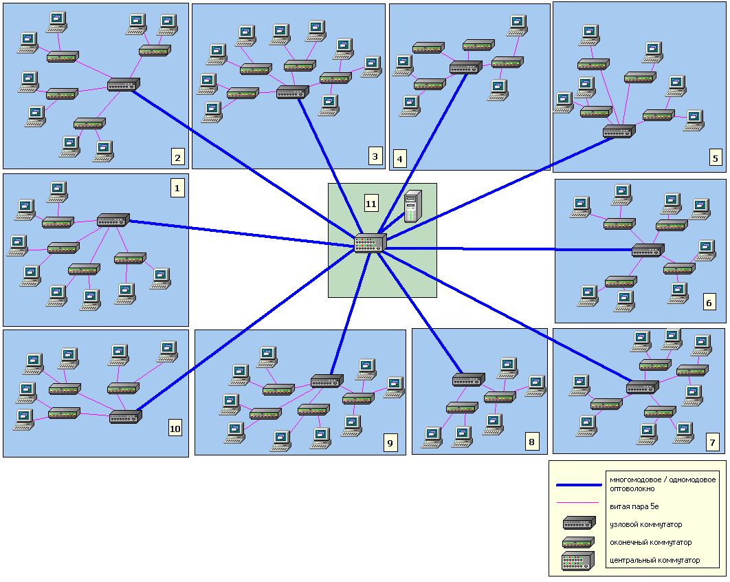 AJTopper Posted July 22, 2006 Author Posted July 22, 2006 (edited) Рисунук - новая схема сети .... (оптика - только одномод) Сеть состоит и 10 сегментов: • Сегмент №1 Узловой коммутатор объединят 6 оконечных неуправляемых 5(8) портовых коммутаторов. • Сегмент №2 Узловой коммутатор объединят 7 оконечных неуправляемых 5(8) портовых коммутаторов. • Сегмент №3 Узловой коммутатор объединят 13 оконечных неуправляемых 5(8) портовых коммутаторов. • Сегмент №4 Узловой коммутатор объединят 6 оконечных неуправляемых 5(8) портовых коммутаторов. • Сегмент №5 Узловой коммутатор объединят 8 оконечных неуправляемых 5(8) портовых коммутаторов. • Сегмент №6 Узловой коммутатор объединят 10 оконечных неуправляемых 5(8) портовых коммутаторов. • Сегмент №7 Узловой коммутатор объединят 7 оконечных неуправляемых 5(8) портовых коммутаторов. • Сегмент №8 Узловой коммутатор объединят 9 оконечных неуправляемых 5(8) портовых коммутаторов. • Сегмент №9 Узловой коммутатор объединят 8 оконечных неуправляемых 5(8) портовых коммутаторов. • Сегмент №10 Узловой коммутатор объединят 5 оконечных неуправляемых 5(8) портовых коммутаторов С большим трудом удалось преобразовать предыдущую схему в звезду =) Далее пришлось отказаться от оптики к оконечным свичам (кстати решили использовать в качестве оконечных коммутаторов - Allied Telesyn AT-FS708LE 8* 10/100TX или AT-FS705L 5* 10/100TX Switch с внешними блоками питания, т.к. с дома больше 8 человек думаю трудно получить будет). Далее при помощи П296 оконечные коммуторы соединяются с узловыми (расстоние до узлового коммутатора не более 200 метров, в будующем на оптику заменем). В качестве централього коммутатора думаем взять ATI AT-9410GB L2 10x10/100/1000T + 2xGBIC в него все магистрали втыкаться будут. Кстати может быть с ним кто-нить имел дело? Встал вопрос в выборе узловых коммутаторов и медиаконвекторов ..... жесть .. голова кругом ... начитался чёрт знает чего .... наверное тоже что-нить из АТИ придётся брать теперь .... вот только что ... посоветутйте плиз .. нагрузка в сети не большая будет (максимум 300-400 пользователей) .... в узловой коммутатор не больше 16 П296 втыкаться будет .... и выходить одномодовая оптика ...... вот теперь и думаю что взять .... я уже на грани истерики .... всё на следующей неделе будет прокладываться .. а с оборудование одни траблы ...... ( и медиаконверторы .... что б их =) ... походу дела нужны с 1000BaseT на 1000BaseFX .... но цены чего-то реактивные !!! по по 700 $ за штуку !!! этож жесть! .... И последний вопрос ... GBIC (Gigabit Interface Converter) для чего используется ???? на TI AT-9410GB их 2 штуки .... Вот что ещё спросить хотел .... стоит ли 2 жилы прозапас на узловом коммуторе оставлять? И как я понял в медиаконвертов втыкается 2 жилы .... и выходит витуха ..... а можно ли одной жилой обойись? (WDM вроде .. или как там эта технология называется .... и уместо ли её в моей схеме использовать?) Edited July 22, 2006 by AJTopper Вставить ник Quote