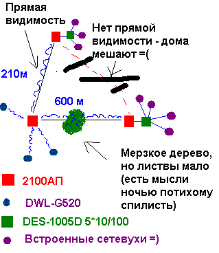бабОска Posted August 14, 2006 Posted August 14, 2006 Приветсвую всех! Извиняйте за дурацкие воросы, практики работы с Вай Фай сетями у меня почти не было =(..... , а друзья мерзавцы всю душу вытрепали .... подавай им сетуху для игр и инета. Живу в частном секторе, расстояния довольно большие ( > 200 м), бюджет ограниченный. Витую пару ( в том числе П296) прокладывать не плучится .... энергетики не разрешают (сцуки, проверяют и срезают), телефонной канализации нету ... всё по столбам (что в нашей стране творится =). Так что выход только 1 - Вай Fi. Перерыв пол Интерента, пришёл к таким результатам: базовая точка 2100АП + всенаправленная антенна (Pacific Wireless PAWOD 24-12) 2 клиентские 2100 АП подключены в свич (к которому подкючены гамеры). Соответсввенно первая 2100АП при помощи антены самодельной (Фа20) конектится к базовой АП (расстояние 210 м), вторая при помощи Антенна "Bester Polyaris - 2400-24" конектится к базовой, в тоже время к свичу витухой. Понаписал тут =) Надеюсь понятно =). Интересует следющее - стоит ли использовать всенаправленную антенну на 12 дец. - рассояние 600м - (уж больно дорогая =(, или же можно обойтись попроще ( Pacific Wireless PAWOD 24-9 на 9 дец.)? На беспроводных клиентах стоят Фа20. Кстати базовая 2100 АП уже стоит 6 месяцев, к ней 2 клиента беспроводных прицеплено. На клиентах и на АП Фа20 стоят (запарились делать =) Уровень сигнала по данным АП - 70-75%. Расстояние 120-180 м. Скачивание - ТоталКоммандер показывает - 2,0 - 2,5 мб/с. Вот такие вот дела ..... Что посоветуете с антеннами да и вообще с моей ситуацией. Заранее благодарен! Вставить ник Quote