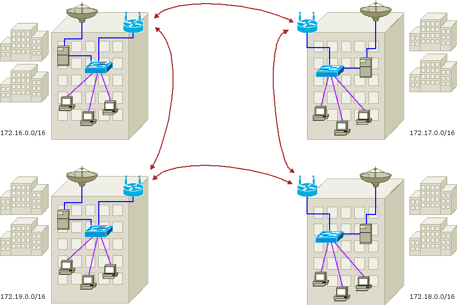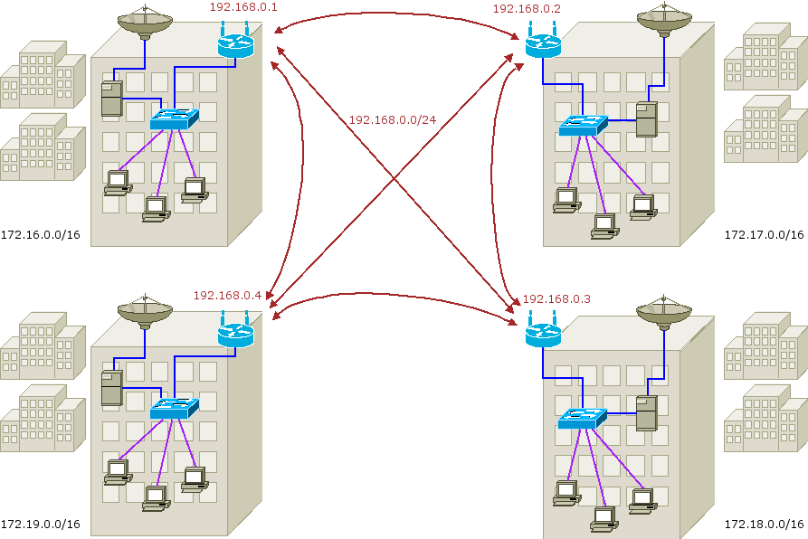 m1jgun Posted October 10, 2006 Posted October 10, 2006 т.е. в итоге схема будет выглядеть чуть иначе: Нет, это вы MESH нарисовали. Схема будет выглядеть как предыдущая, только 172.16.0.0 будет соединена с 172.19.0.0 одной 2100, а 172.16.0.0 и 172.17.0.0 будет соединена уже другой ТД. И так далее. То-есть на каждом доме по ДВЕ 2100. В идеале еще поставить и еще по одной, чтобы реализовать MESH и исбыточность по маршрутам, но это надо будет в ТРИ раза больше точек доступа. Вставить ник Quote