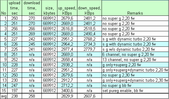 SSD Posted January 31, 2007 Posted January 31, 2007 Вчера приобрел два dwl2100 h/w ver.:A4 F/W ver.:2.20euподключил к двум достаточно мощным машинам для тестирования реальной скорости передачи "на столе" для тестирования скорости передачи через линк, в разных режимах (но р2р) прокачивался фильм по СМБ протоколу. размер известен, время замерялось секундомером нокия6100. Эфир вокруг кристально чистый. результаты приведены в таблице. СМ АТТАЧ 1.оригинальная прошивка 2.оригинальная прошивка второй раз для замера разбросов 3.заинтересовала ассиметричность upload download - поменял точки местами - вывод виноваты не точки а особенности хостов. 4.еще один контрольный замер - для замера разбросов 5.включен режим super G with dynamic turbo 6.повтор п.5 для оценки разбросов 7.включен режим super G without dynamic turbo 8. то-же что п1.-п.4 на 6 канале (перестал замерять довнлоад) 9.то-же что п1.-п.4 на 13 канале !!канал не влияет на скорость!! ;) 10. см. коммент 11. см. коммент 12. перешил точки на последнюю прошивку 2.30 режим как в п.1- на скорость перешивка не повлияла 13. то же что и 12, только включен super G with dynamic turbo - на скорость перешивка не повлияла 14. прошил блюбоксом - режим как в п1. но !!скорость повышена!! 15. блюбокс + еще включил pureg - скорость говорит сама за себя 3400КБ/с - рекорд Видно что скорость далека от тех заявленных 54Мбит/с или тем более 108, маркетологи блин. Можно ли изменять еще какие-то параметры с целью повышения скорости? в том числе не побоюсь изменений требующих вмешательства в конструктив. Где я мог сделать ошибку? Что подскажут бывалые? Форум почитать Вставить ник Quote