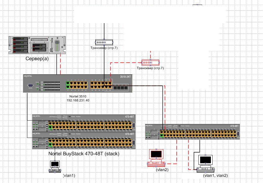 vyruz Posted March 30, 2007 Posted March 30, 2007 Требуется помощь. С Вланами ни разу не общался... Используемое оборудование - Nortel 3510 и 470-48Т. требуется: приходящие даныые на порт 3510 (допустим 20-й), изолировать от большинства портов на свиче (другой влан), кроме определенных (к примеру 10-15) на которых компьютеры должны видеть оба влана, так же передать на (21-й) порт оба этих влана, на другом конце - 470-48T. На нем - опять же разделение, одна группа портов должна видеть только влан2, другая - оба влана. На 20-й порт 3510 приходит линк от неуправляемого оборудования. Т.е все что там надо дать кому надо. Схема прилагается - красный пунктир - требуемый влан (рисовалось в спешке, трансивер на нем как раз то откуда все приходит) Вставить ник Quote