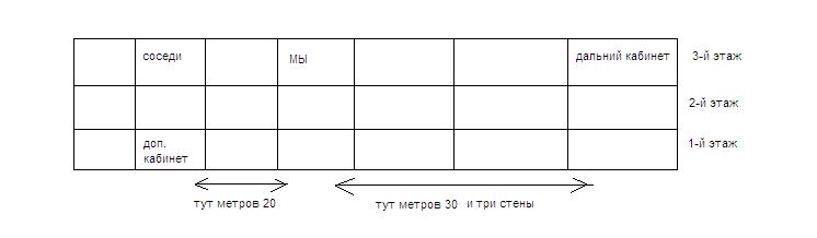 4Q! Posted April 29, 2007 Posted April 29, 2007 (edited) Такая ситуация: у нас в офисе есть ноутбук с WiFi он постоянно видит одну беспроводную сеть - наши соседи по этажу. причем до соседей метров двадцать через две стены. у ноута антенна встроенная. в WinXP уровень сигнала показывается как два деления из пяти. Нам в тоже надо сделать беспроводную сеть в дополнение к имеющейся витой паре. от нас в наши дополнительные кабинеты. собственно вопрос если ноутбук с внутренней антенной чует соседскую сеть на 2 из 5. то будут ли компы с нормальными PCI картой с внешней антенной, видеть точку доступа которую мы поставим у себя. если компы стаить в доп. кабинетах. а точка доступа - где написано МЫ. у кого есть опыт - подскажите плиз. точку доступа думаю использовать: http://www.trendnet.com/ru/products/TEW-610APB.htm а PCI адаптер: http://www.trendnet.com/ru/products/TEW-623PI.htm рисунок изобразил - для понятности. Edited April 29, 2007 by 4Q! Вставить ник Quote