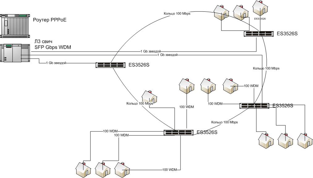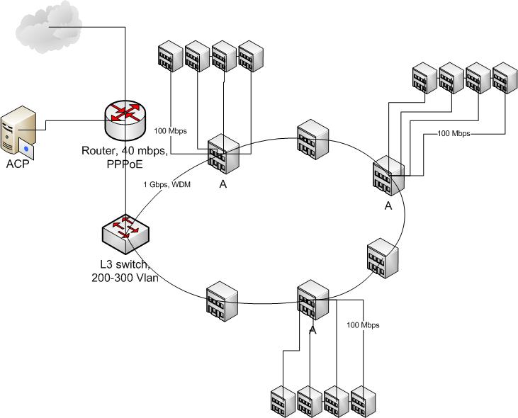 kefiroid Posted August 8, 2007 Posted August 8, 2007 (edited) Появились средства на модернизацию сети. Решил посоветоваться. Решил завести на каждый дом по VLAN. Бросать все в центр у меня не получится (ограничен волокнами), но вот создать распред.сеть и закольцевать ее - вполне возможно. Вижу это себе через создание 8-10 промежуточных узлов, от которых идет звездой волокно до дома с соткой на борту. В свою очередь эти узлы связаны кольцом на гигабите. Гигабит хоцца реальный, а не для "лампочки". В центре, на Л3, хочу разрулить вланы, почистить трафик и выплюнуть его на рутер. Портов в свиче должно быть 10-16. Ну и самое сложное для меня место - маршрутизатор. Хочу избавиться от ПС. Посоветуйте кошку: имеем канал в 40 мегабит (расширимся скоро до 70). Доступ к нету по РРРоЕ. NAT сейчас используем, но хотим перейти на белые адреса. Так что, нат в циске не нужен. Вопросы: 1) какой роутер взять? 2) какой Л3 свич? 3) какой свич на промежуточный узел (маркировка "A")? Edited August 8, 2007 by kefiroid Вставить ник Quote