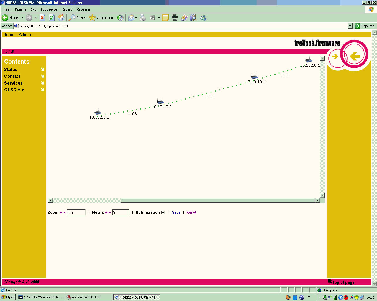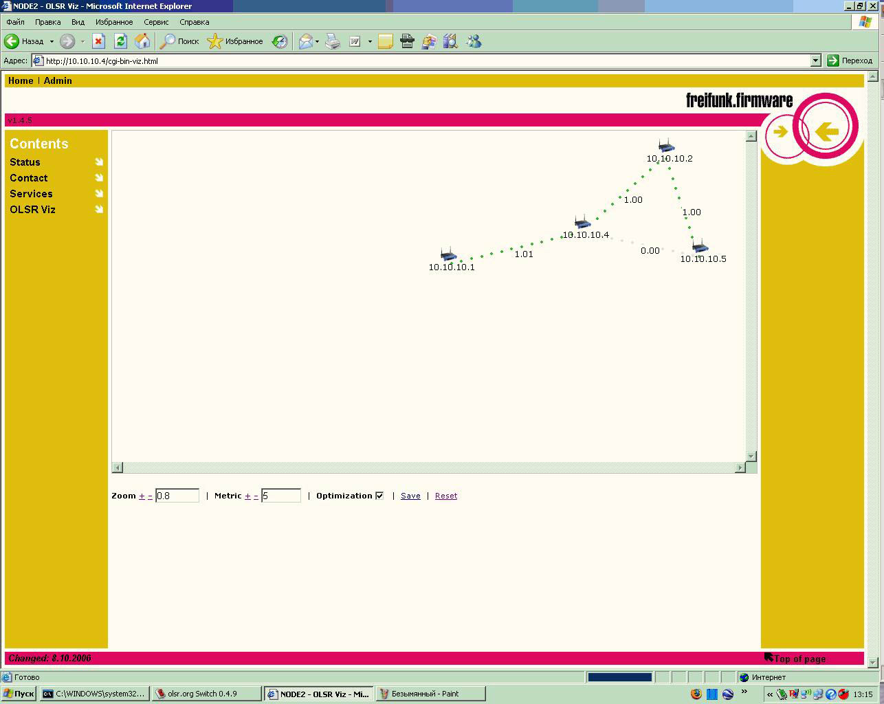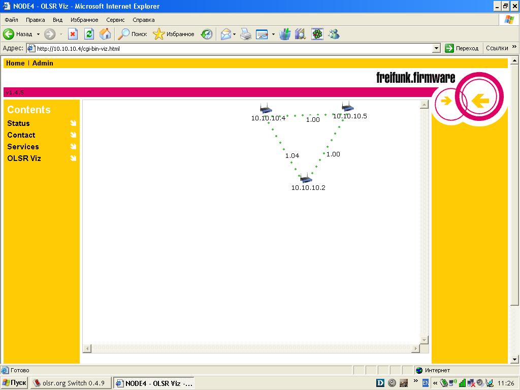 LordFAntom Posted August 31, 2007 Posted August 31, 2007 (edited) Кто нибудь пробовал запускать AODV или OLSR на Linksys c прошивкой OpenWRT ? мои попытки с openwrt оказались не удачными ))) зато нашел другую прошивку от немцев ))) + OLSR для Windows результат 1 точка ASUS WL500 Deluxe 1 точка Linksys 54GS v 6.0 1 ноут +USB Dlink 120+ 1 комп +PCI Dlink 520+ на скринах собственно все видно но хотелось бы все таки запустить на OpenWRT (железа больше) http://start.freifunk.net/ ps забыл вот запуск OLSR на Windows http://wiki.freifunk.net/OLSR_mit_Windows Edited August 31, 2007 by LordFAntom Вставить ник Quote