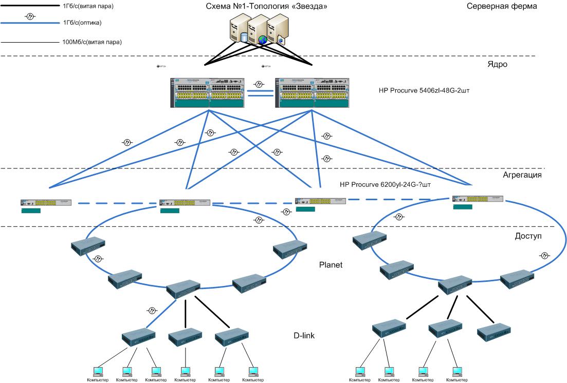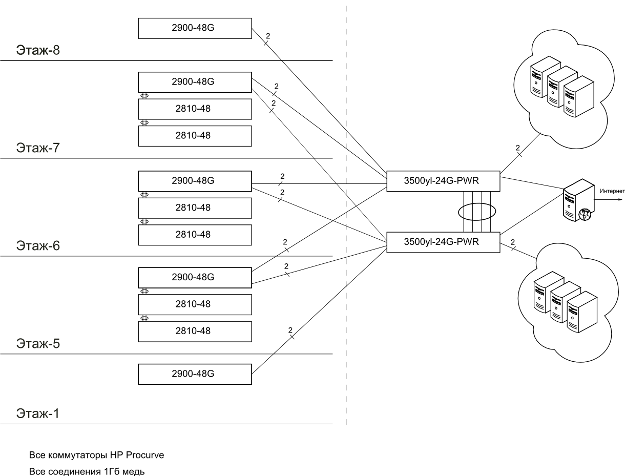Shavlia Posted February 20, 2008 Posted February 20, 2008 Оцените пожалуйста критическим взглядом прилагаемую схему. В плане оборудования ;). Сеть для организации из ~400 чел. Нагрузка относительно небольшая. Несколько файловых серверов и БД. Планируетя с учетом перспективы (отдаленной) и последующего перевода магистралей на 10Гб с докладкой оптического кабеля. Нам сильно рекомендуют использовать коммутаторы dell в силу их большей дешевизны и более дешевых модулей и трансиверов. Можно ли на них построить аналогичную конфигурацию? Выскажите пожалуйста мнение: HP vs dell. Вставить ник Quote