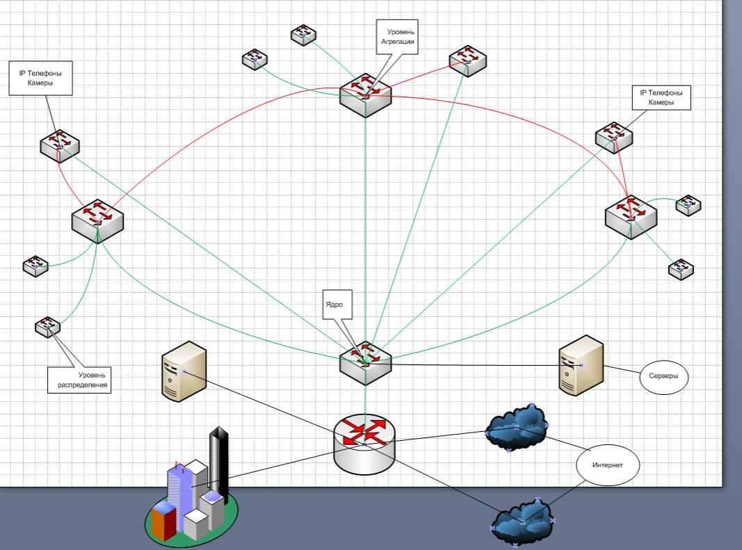 Smersh Posted February 13, 2008 Posted February 13, 2008 Топология кольцо. Для реализации планируем использовать RSTP. На уровне агрегации пока L2, потом планируем L3. Все комутационное оборудование - управляемое. Зеленые соединения - то как идут пакеты при нормальном функционировании сети. Красные соответственно резервные - задействуются при аварии/обрыве. Необходимо также внедрить ip телефоны + камеры - свитчи под них планируется соеденить напрямую с ядром. Если что не так - опять же по резервному волокну. Вставить ник Quote