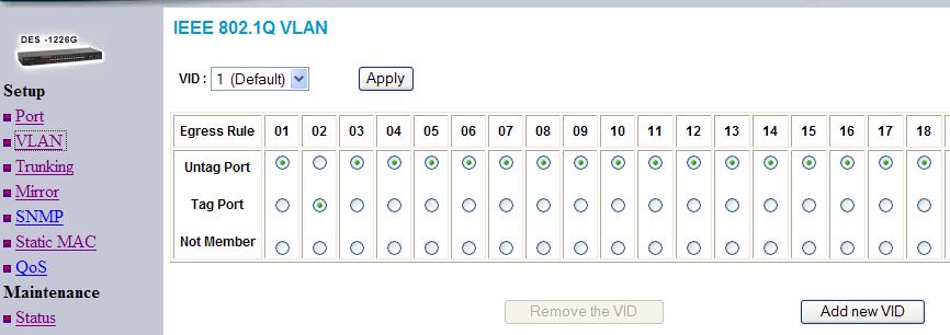 user_anonymous Posted February 20, 2008 Posted February 20, 2008 (edited) Подскажите. Свитч 1226G, две группы влан. Один порт включен в обе группы. Раньше была прошивка 2.001. как на эмуляторе http://support.dlink.com/emulators/des1226g/. (пароль admin) Там был раздел "Port-based VLAN" где группы могли перекрываться. Теперь последняя с высланой прошивкой есть только пункт "IEEE 802.1Q VLAN" Там собственно тегированые и нетегированые вланы. Как мне настроить? Нетегированые вланы перекрываться не могут, а с тегироваными я вообще мало что понял. PS: речь о веб интерфейсе. Допустим, что второй порт - это тот, котрый уходит со свича. По нему нам нужно пустить два вилана - допустим VID = 2 и VID = 3 1. войдите в вебморду 2. нажмите "добавить новый вилан" с тегом 2 3. установите порт 2 как tagged а потры, куда будет вываливаться трафик из этого вилана как untagged. Сохраните 4. опять нажмите "добавить новый вилан, только теперь с тегом 3 5. установите порт 2 как tagged а потры, куда будет вываливаться трафик из этого вилана как untagged. Сохраните Теперь у вас есть два вилана. Но это еще не все - по крайней мере для других свичей ДЛинк это так. Нужно еще зайти в PortVID Settings и прописать там идентификаторы виланов для портов. Да, чуть не забыл. Те порты, что у вас untagged в других виланах надо пометить как not member. Edited February 20, 2008 by user_anonymous Вставить ник Quote