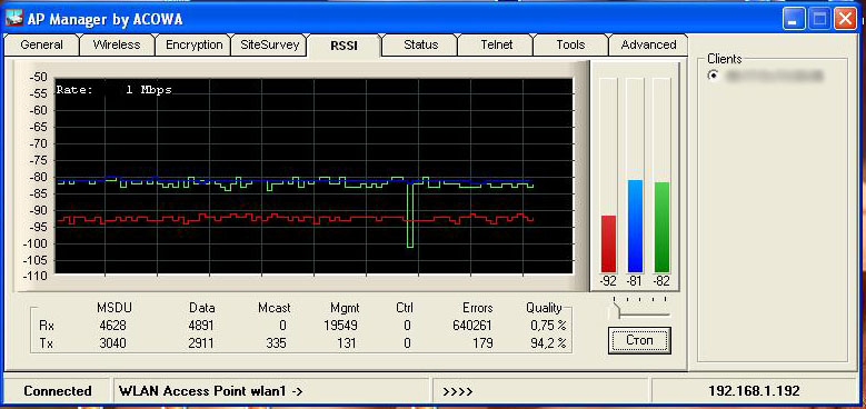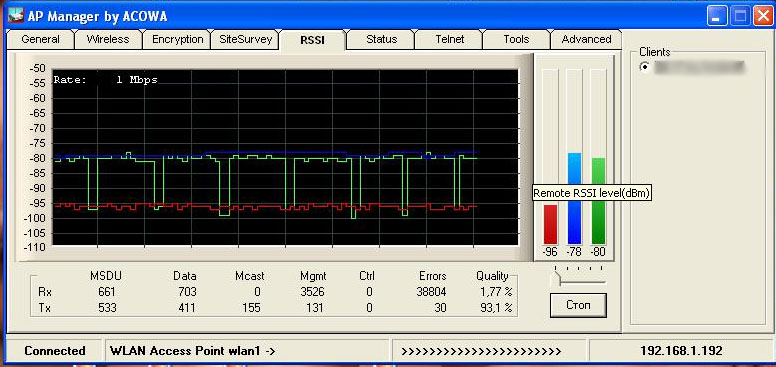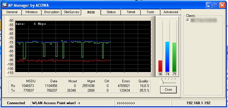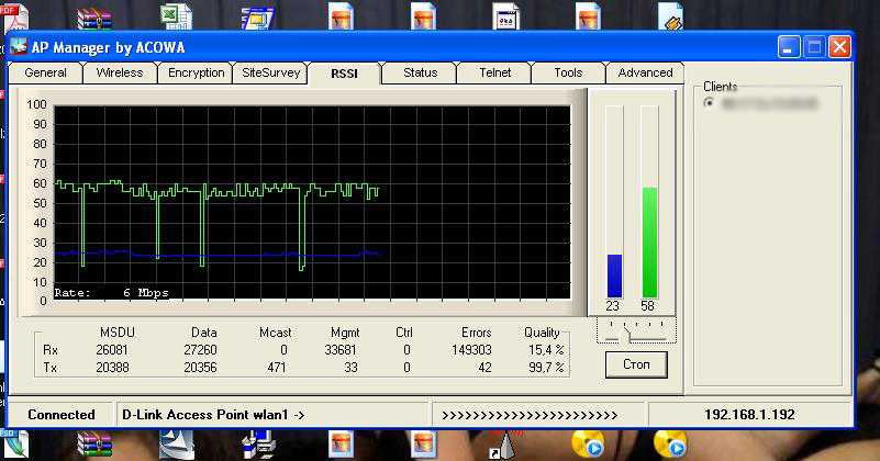 dengus Posted March 3, 2008 Posted March 3, 2008 (edited) У вас очень большой разбаланс уровня принимаемого сигнала: Перешивка в BB это вобще катастрофа--хочешь что б dlink плющило перешей его в BB. Я конечно верю что она работает на линках P2P,но заставить DWL2100 корректно работать с BB прошивкой мне так и не получилось. Во первых после прошивке в BB точка отказываеться напрочь видеть эфир.Часть telnet команд не работает,которые прилагаються к описанию. Во вторых подключить ее куда либо мне так и не удалось,как я не мучал точку.В третих если залить родную прошивку то точку плющит намного сильнее. Да и нет у меня уверенности что BB прошивка вобще работает на точках REV A4. p.s. Люди кто прошивал DWL2100 в BB купленные в 2008 году? У кого работает? На этой неделе буду ставить p2p линк на двух 2100A4 прошитых в BB. На столе работают. С помощью ВВ можно просканить эфир только когда она сама работает в режиме AP. Иначе никак не получится. Edited March 3, 2008 by dengus Вставить ник Quote