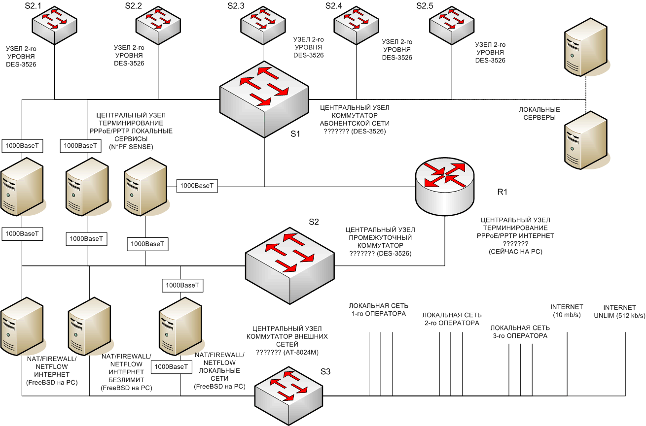 VLB40 Posted March 30, 2008 Posted March 30, 2008 (edited) Вот решил обратиться за консультацией к уважаемому ALL :) Есть узел сети около 1000 пользователей, сеть потихоньку растёт и думаю ближайшие года два нужно думать о перспективе 2000 и больше клиентов. Есть центральный узел и узлы 2-гоуровня (в данный момент 5 шт., будет 8-10) Оптика. На доступе каша из неуправляемых Акорпов/Длинков, DES-1226/2108, AT-8012/8024. На узлах 2-го уровня DES-3526 В центре тоже 2 шт DES-3526 и 1 шт. AT-8024M. Авторизация PPPoE (опционально PPTP), локальная сеть с DHCP. Для доступа к доп. сервисам сети (пока это выход в другие локалки) используется отдельное соединение PPPoE со своим именем сервиса. Всё сделано на ПК. Авторизациию в Интернет и для локалок пробуем на нескольких ПК с пакетом pf sense, связанных протоколом CARP. В сети поднят OSPF. Сейчас приводим сеть к такой схеме как на рисунке. На DES-3526 настроены фильтры, разрешающие приём ответов PPPoE и DHCP только с аплинк порта, включён broadcast storm control. Какие типичные проблемы в сети: вирусный флуд, чужие PPPoE сервера через ADSL модемы, используемые как свитчи и DHCP с них же. Что инетресует (если по рисунку): Коммутатор центрального узла S1 8-10 оптических одноволоконных 1Гб портов, 4- 8 медных 1Гб портов, (насколько там нужен L2+ или L3). Коммутатор 10-12 1Гб медных портов на место S2 (насколько там нужен L2+ или L3). Коммутатор 24 10/100 портов и 2 порта 1Гб (один с одноволоконным SM SFP для подключению к провайдеру Интернет) на место S3. Как минимум L2+ а может и L3. Что аппаратное подобрать на место R1 для терминирования 0,5 - 1 - 2 тысяч PPPoE/PPPTP Интернет сессий (может чуть фильтров ещё, а может и нет). Стоит ли собирать S1, S2, S3 в одну железку. Как на этом месте смотрелся бы Cajun 550/580 Как у него с сертификатом СССЭ? Наверняка он просрочен, кто знает как обойти это? По ценам: коммутаторы суммарно в районе 1-1,5 k$, R1 – до 1k$ Мы сейчас основное вливаем в оптику, узел пока держится, но есть желание сделать его чуть посолиднее и поскоростнее. Сейчас пока всюду 100 Мб Ещё вопрос, с какого кол-ва пользователей советуете бить на VLAN и маршрутизить их? Пока что в эти деньги увидел: У Нага 3Com SuperStack III 4900 на место S2 (но нет OSPF, а вдруг понадобится). Allied Telesyn AT-9816GB на место S1 (интересно, а у него full layer 3 активирован) Dell PowerConnect 6024 - на место S1+S2 – этот понравился больше всего ценой и кол-вом портов :) На место S3 Extreme Networks Summit 24e3 Allied Telesyn Rapier 24i Первый лучше, т.к. SFP есть Опять же, как у них с сертификатами ССЭ и опциями L3? У Вимкома нашёл Rubytech FGS-2824 8-Port TP+16-Port SFP GbE L2 Managed Switch на место S1+S2 но походу даже ACL нету :( И вот это не нравится: Note : FGS-2824 only supports the SFP transceiver from the following vendors. 1. Ruby Tech Corporation 2. Avago Technologies 3. Finisar Corporation Вопрос ещё к Нагу GBIC SFP WDM 20км 1550nm (Bidirectional) GBIC SFP WDM 20км 1310nm (Bidirectional) это пара для работы друг с другом, или каждый должен работать в паре с аналогичным? И прибор для прошивки SFP для чего нужен. "Для прошивки SFP" не говорить, я догадливый:) Прошивать SFP под чужие? Edited March 30, 2008 by VLB40 Вставить ник Quote