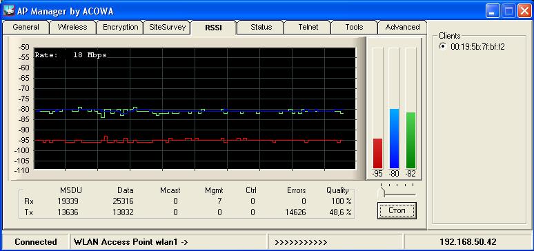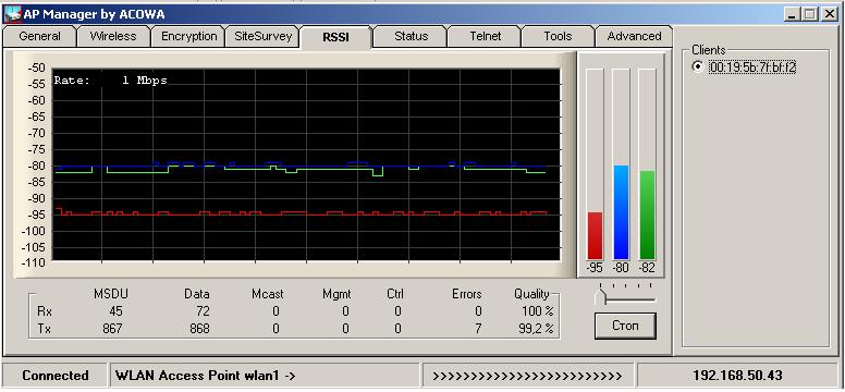 sval Posted May 8, 2008 Author Posted May 8, 2008 (edited) Скриншот раздела RSSI покажите. Нужен график шума и приёмного сигнала в динамике (утилита AP manager) Вот. Скриншот сделан после ребута точки, поэтому ошибок ешё нету. Edited May 8, 2008 by sval Вставить ник Quote
