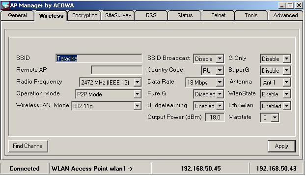Atrides-1 Posted May 8, 2008 Posted May 8, 2008 Поставьте режим на обоих точках 802.11g only G super G disable pure G disable data rate BEST Уровень шума у вас какой в канале? Вставить ник Quote