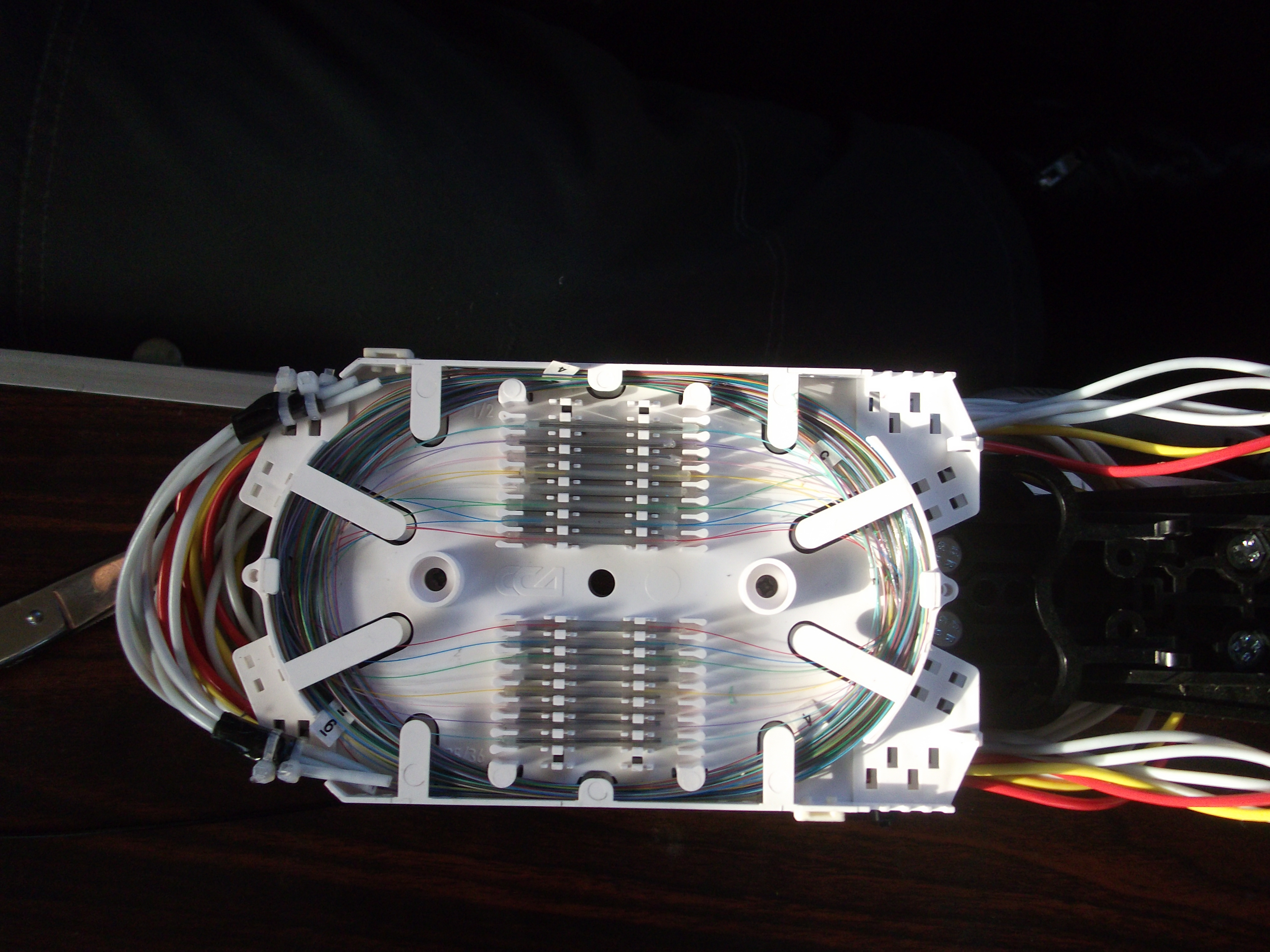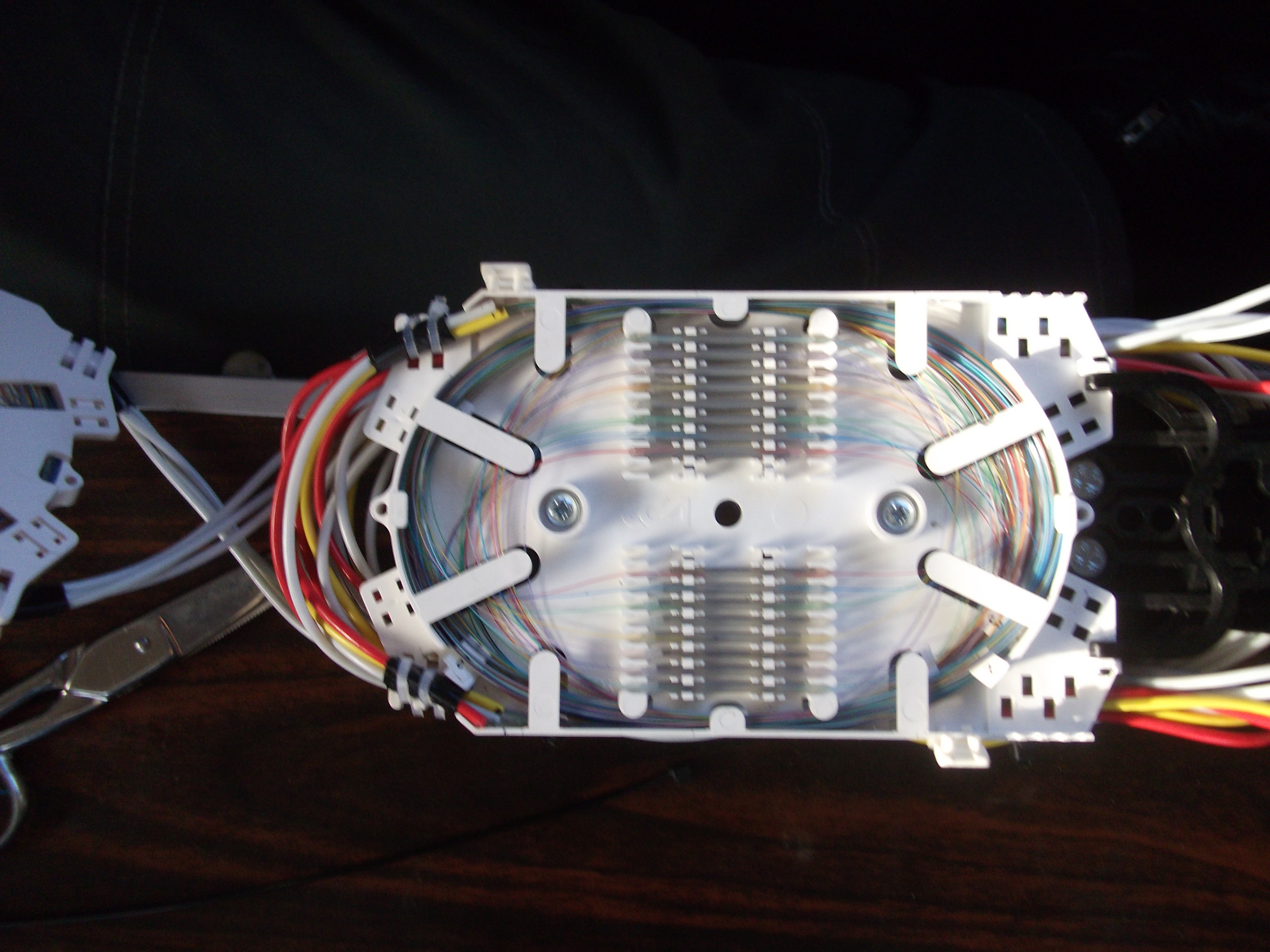 Error_404 Posted November 9, 2011 Posted November 9, 2011 Варим МТОКИ. Новые кассеты достаточны удобны в монтаже. Разделываю примерно 2,2 - 2,5 метра кабеля на глаз. где то метр уходит на запас в модулях (один виток в так называемый подвал). Модули завожу с обратной стороны от ввода. 48 волокон укладываю в две кассеты на 36 волокон, каждая, т.к. при необходимости можно будет доварить какую то отпаечку. В кассету укладываю по 2,5 или 3 витка волокон с каждой стороны, согласно расцветки в паспорте. получается весьма эстетично и практично. Если необходимо поднять кассету то она повисает на модулях приподнимаясь вверх, т.е. удобство работы без всяких дополнительных приспособлений. Ну и по укладке волокон. Подмеряю два модуля на одну сторону сплайс - пластины третий модуль на другую сторону (если знаю куда возможныотпайки стараюсь как раз вынести этот модуль отдельно, для себя или для последующих монтажников). Ну и фото Вставить ник Quote