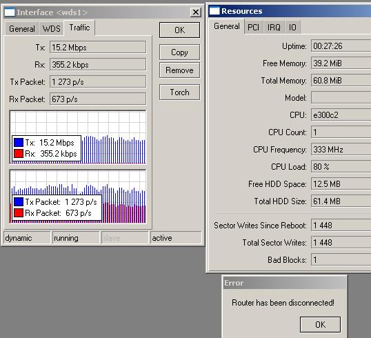 open Posted December 12, 2008 Posted December 12, 2008 RB333POH (350mWt), линк 10 км., WDS, TX/RX -62/-63dbm, nstreme включен.При перекачке файла более 1Гб сначала устанавливается скорость порядка 25-30Mbit/s и все какое-то время (по-разному) красиво - файл льётся, CCQ - 95-100%, загрузка CPU около 40% (правда временами кратковременно прыгает до 100% ). Далее "передающая" сторона уходит в ребут... В её логе такая запись router was reboot without proper shutdown by watchdog timer Естественно все отваливается, но если "качать" с помощью killcopy, после ребута "связь" восстанавливается, но! Скорость болтается около 6Mbit/s, CCQ выше 35% не поднимается. Такое состояние может проболжаться сколь угодно долго. На картинке "показания" винбокса после ребута. На "приемной" стороне все путем, за исключением записи в логе о потере связи с "базой". Если ребутнуть "базу" вручную, то скорость поднимается до 16-18Mbit/s, также CCQ 95-100% и какое-то время работает. Далее снова "авторебут" и снова 6Mbit/s.... :( Где, что копать?? Обнови прошивку для начала. Вставить ник Quote