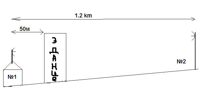 d2r Posted January 15, 2009 Posted January 15, 2009 Растояние между домами 1.2 км.А можно ли разместить антенны/антенну правее/левее? Чтобы здание не мешало. Антена №1 установлена на крыше на мачте (сумарная высота 9м). Антена №1 установлена на мачте ( высота 10м). между домами находится частный сектор (одноэтажные дома), но есть одно 3-х этажное здание см. Рисунок Высота 3-х этажного здания метров десять максимум, если не ошибаюсь... Выше поднять одну из антенн (ближнюю к зданию) никак? Вставить ник Quote