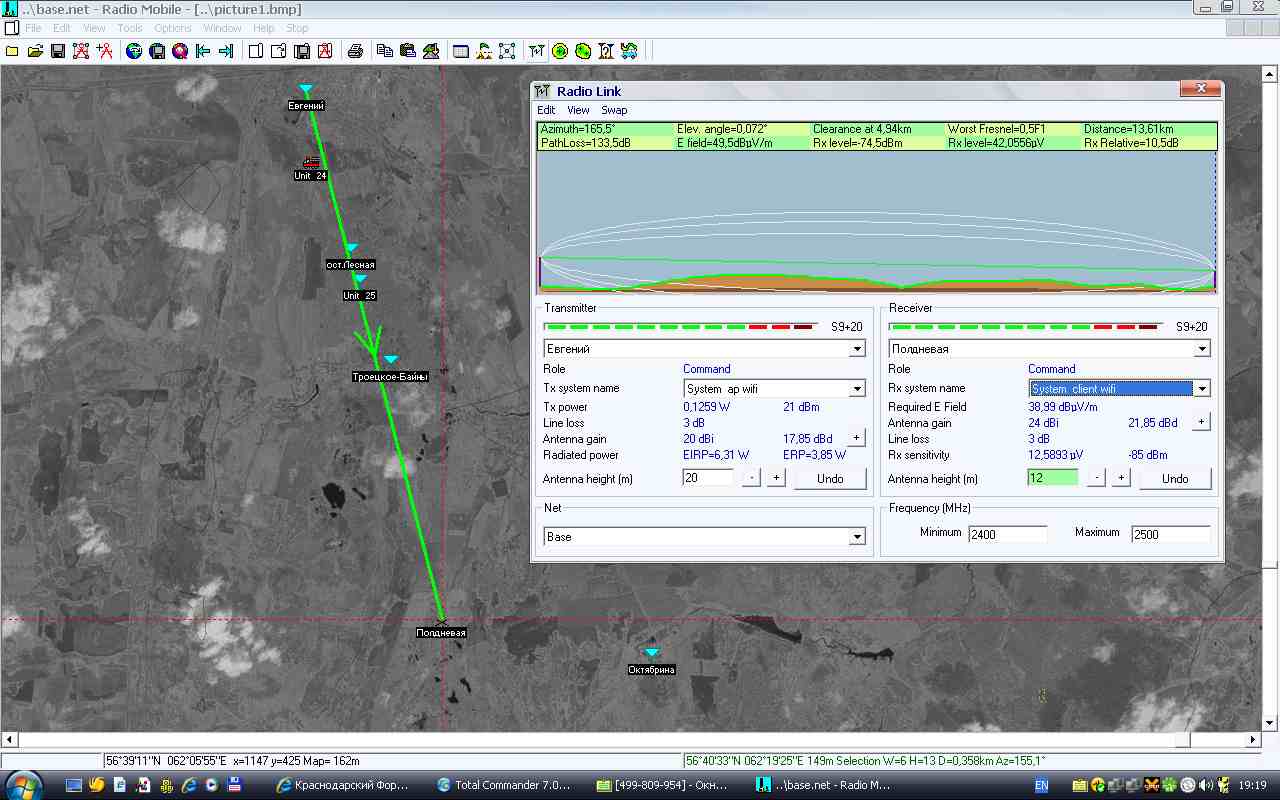 djon_bogd Posted January 24, 2009 Posted January 24, 2009 Доброго времени суток всем. При организации линка на растояние 14км возникли сложности с наводкой двух офсетных парабол друг на друга. Пдскажите пожалуйста как можно точно навести их? Ракетницы солнечные зайчики не предлагать:) Информация об используемом оборудовании: с одной стороны высота установки параболы 0.6м 20метров над уровнем земли, точка доступа д-линк 2100 с прошивкой вв выходная мощность 21дби 125мвт, на противоположной стороне парабола 0.9м 12метров от земли высота установки, точка доступа аналогичная. Скрин из программы радио мобайл с высотами прилагаю. http://www.lan23.ru/forum/attachment.php?a...mp;d=1232806803 Вставить ник Quote