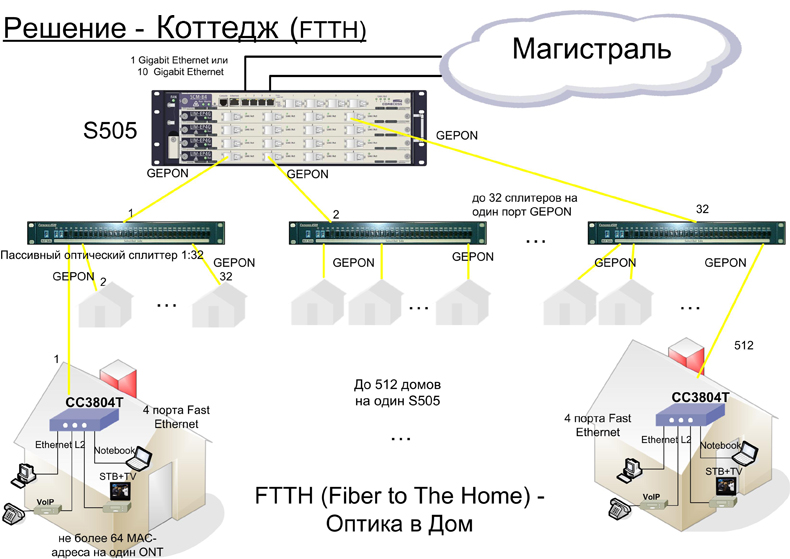 @NET Posted March 13, 2009 Author Posted March 13, 2009 Сплиттер на столбе, хм - так ведь сопрут же, увидят диковину железку и сопрут :) Сплитттер не железка, это кусок термоусадки размером со спичку. Ставится в муфту, их в моем поселке несколько сотен, еще ни одну не сперли. Если работать по серьезному - единственный вариант - PON (GEPON). Как я понимаю эту технологию. У оператора размещен OLT (оптическое линейное окончание, например NEC ME2000), от него на один оптический кабель (типа локальная магистраль) где-то там насажен пассивный оптический разветвитель (сплиттер, такая коробочка куда входит оптволокно от OLT и выходят 32 опволокна на абонентов). Уже у абонента этот кабель входит в ONU (оптический сетевой блок) и далее с него идет обычная витая пара на комп. Вот мне непонятно, вот я протянул линию до одной точки, на ней поставил сплиттер, дальше я с этой точки тянуть линию дальше могу, чтоб дальше поставить еще один такой сплиттер и так далее в пределах общего числа подключенных пользователей на одну такую линию 32. Так или я опять не врубился? Вставить ник Quote